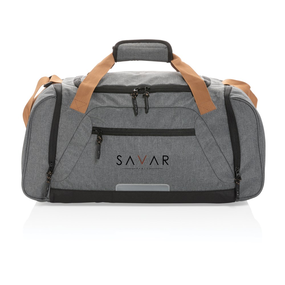 The Impact AWARE™ Urban outdoor weekend bag has more than enough room for a weekend getaway! It also has an outdoor-inspired design. The bag features a front zipper compartment and one big main compartment. The side zipper pockets offers quick access to your daily essentials. The backpack is made with two tone 50% recycled polyester and 100% recycled polyester lining. With AWARE™ tracer that validates the genuine use of recycled materials. Each bag has reused 24.05 0.5L PET bottles. 2% of proceeds of each Impact product sold will be donated to Water.org.