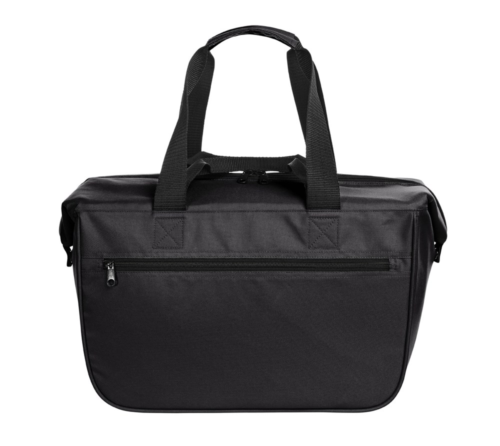 Innovative flexible cooler basket; large 2-way zipped main compartment; volume can be increased via side press stud flaps; zipped front pocket; washable inside; carrying system with double handles and padded handle cuff for best carrying comfort; folds up