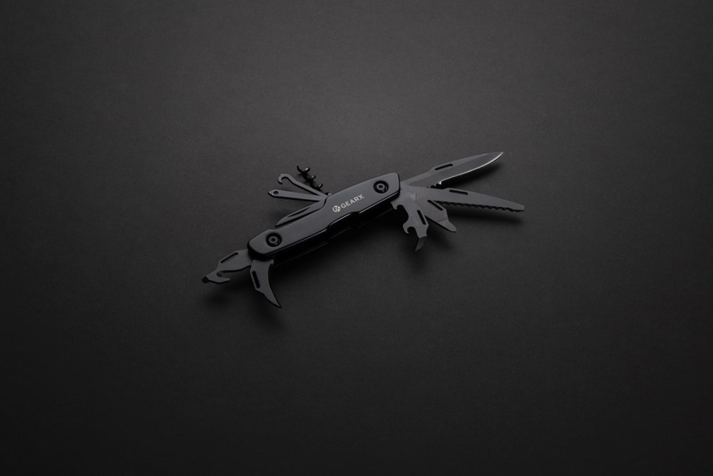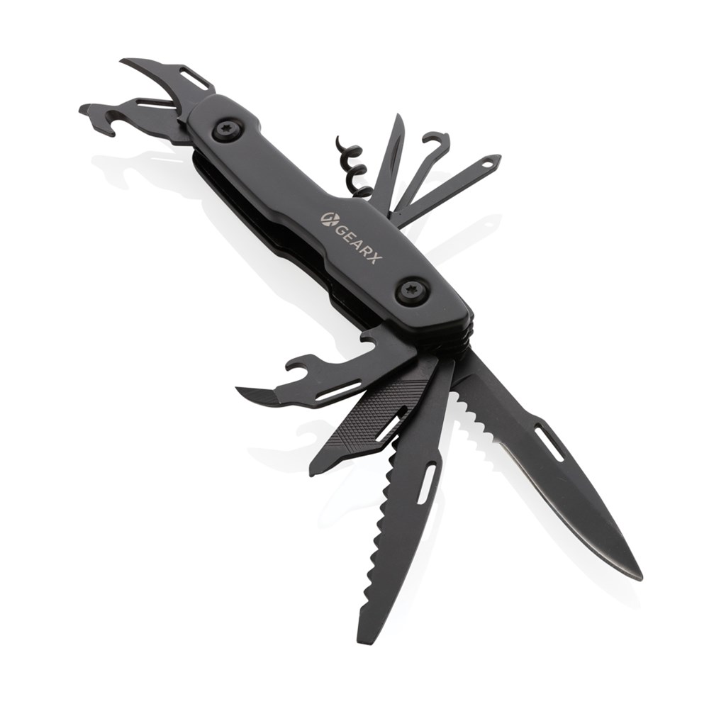 Straight clear lines combined with great functionality. This multifunctional tool combines it all, in one pocket sized essential. The luxury aluminum body is matched with premium grade 420 stainless steel tools all presented in black. The 13 functions include: Knife, saw, slotted screwdriver, can opener, file, small Philips screwdriver, Philips screwdriver, corkscrew, thread guide, leather punch, box cutter, bottle opener and small blade. This multifunctional knife is ready for use when you need it. Packed in luxury gift box.
