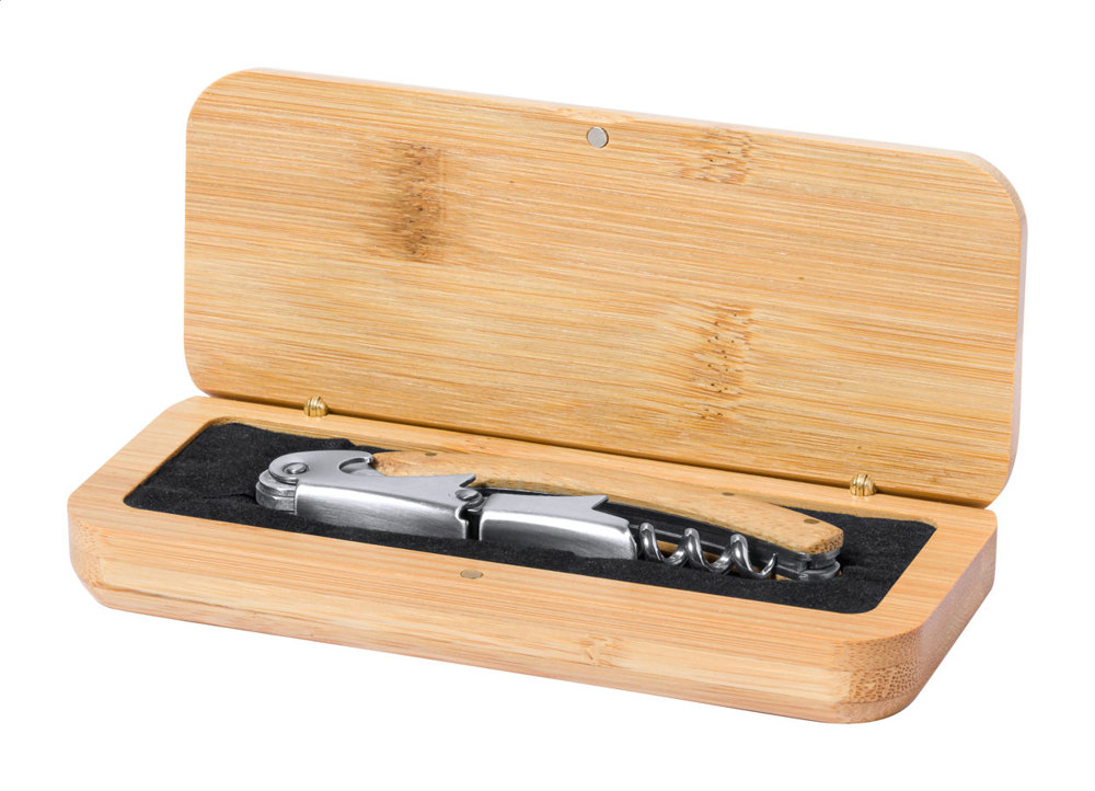 Stainless steel corkscrew with bottle opener and bamboo handle, in bamboo box. more