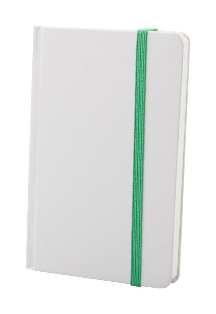 White carton covered notebook with 80 blank sheets and coloured rubber strap. A6 size.