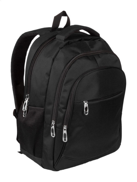 600D nylon backpack with multiple zipped compartments, padded laptop pocket (15"), back and shoulder straps.