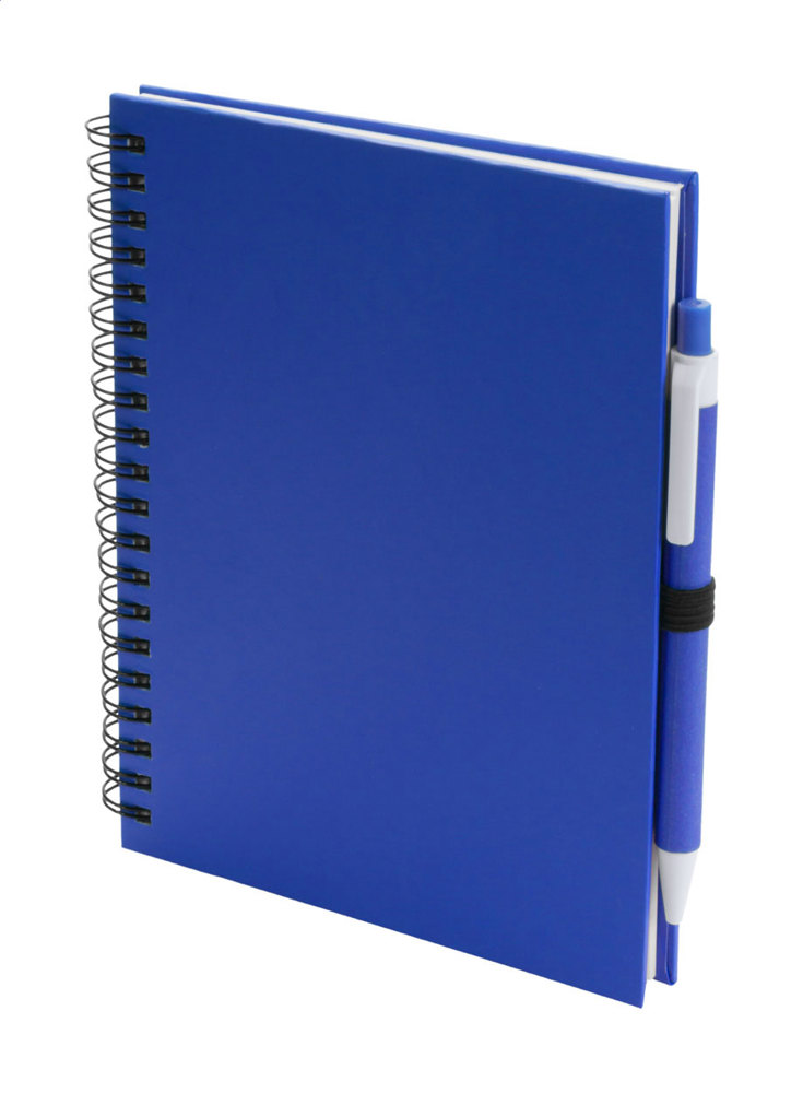 Carton covered spiral notebook with 70 blank sheets, and matching colour recycled paper ballpoint pen with blue refill.