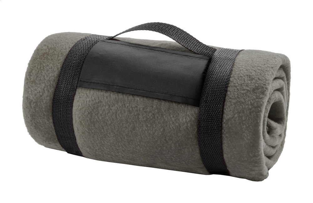 Polar fleece blanket with velcro carry strap. 100% polyester, 200 g/m².