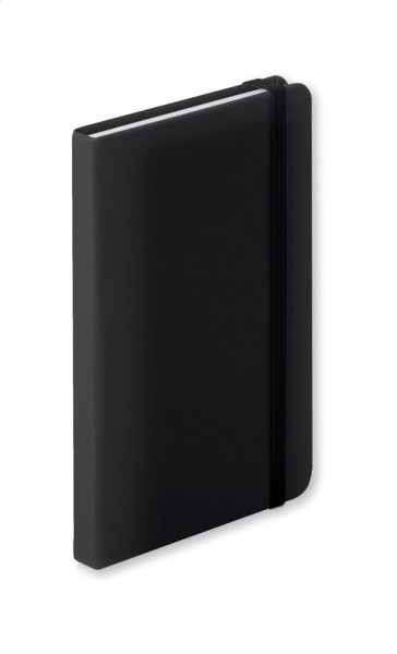 PU leather covered notebook with 100 lined sheets, bookmark and rubber strap. A6 size.