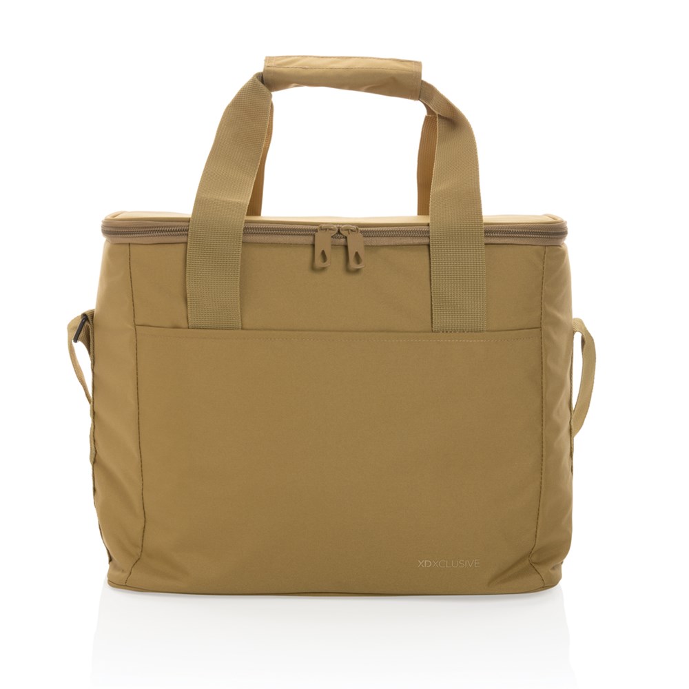 Pack your favourite food or beverages in this cooler bag! This beautiful large cooler bag can store up to 20 cans. With one front pocket for extra storage. All the hardware details are in the same colour as the exterior. Incorporating the AWARE™ tracer that validates the genuine use of recycled materials. Each cooler bag reused 10.3 PET bottles. 2% of proceeds of each Impact product sold will be donated to Water.org. Composition exterior 100% recycled polyester. Lining in PEVA.