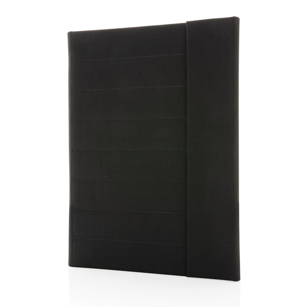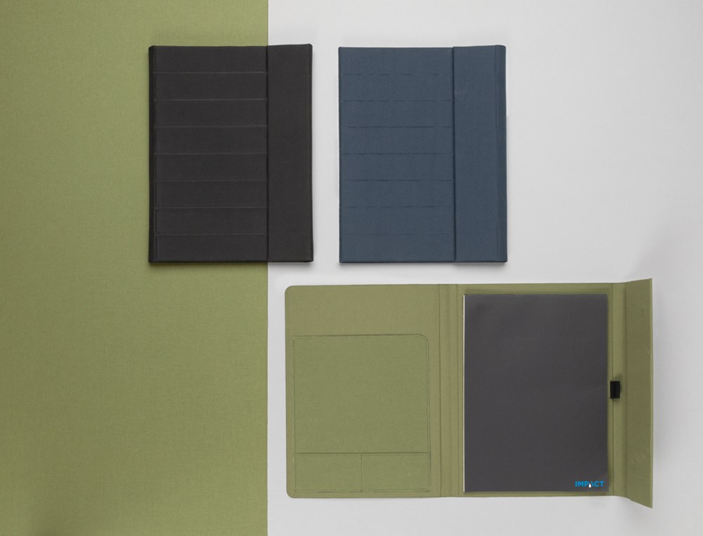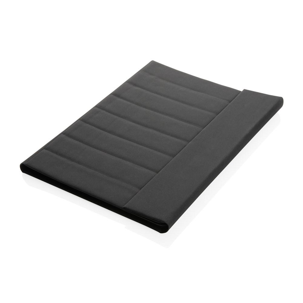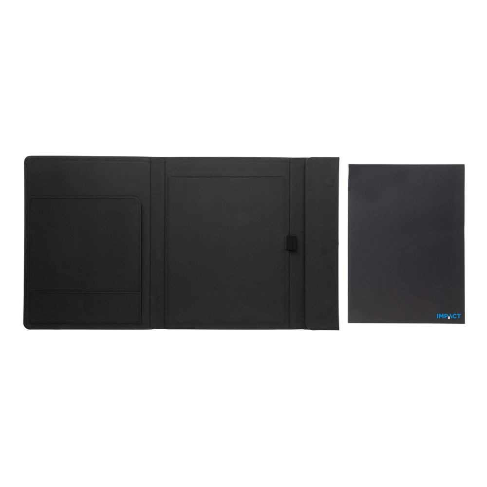 Keep all your work essentials organised with this beautiful A4 Aware™ RPET portfolio with magnetic closure. Inside you will find 1 big sleeve pocket, 2 additional pockets and a pen loop. Including FSC recycled paper notepad. The notepad contains 20 sheets cream coloured lined 70gm/s recycled paper. Interior and exterior 100% recycled polyester. With AWARE™ tracer that validates the genuine use of recycled materials. Each portfolio has reused 3.2 0.5L PET bottles. 2% of proceeds of each Impact product sold will be donated to Water.org. PVC free.