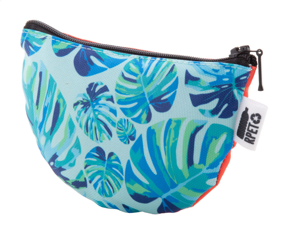 Custom made, half circle shaped zipped purse in 600D RPET polyester. With distinctive RPET label and all over sublimation printed graphics. MOQ: 50 pcs.