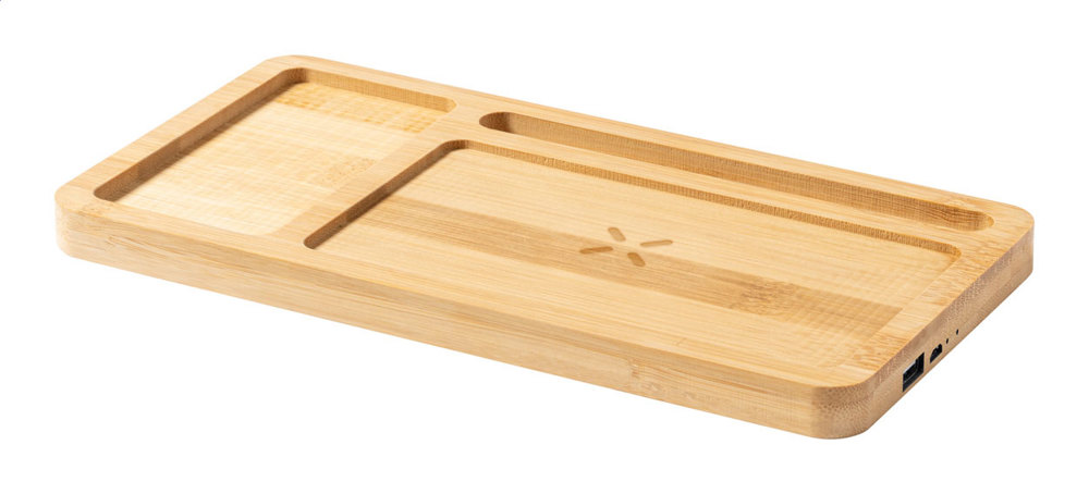 Bamboo desk organizer and mobile phone holder with built-in wireless fast charger (15W). With USB charger port for charging 2 devices simultaneously (1 wirelessly and 1 via cable). Max. output: 2000 mA. Including USB charger cable.