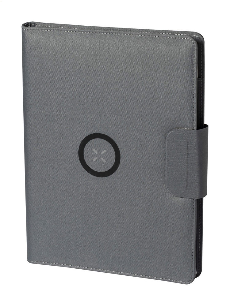 A4 sized, 300D RPET polyester document folder with built-in magnetic wireless fast charger (10W), 5000 mAh power bank with USB charger port, foldable mobile holder and 20 lined sheets notepad. Including self-adhesive metal ring to use the magnetic function on any wirelessly chargeable device. Including USB charger cable.