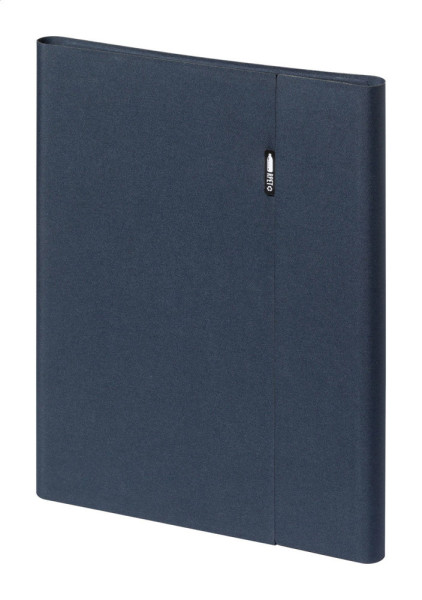A4 sized, 600D RPET polyester document folder with magnetic closure, foldable mobile holder and 20 lined sheets notepad. With distinctive RPET label.