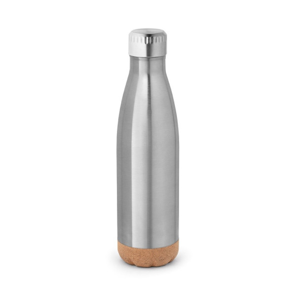 Double-walled vacuum insulated stainless steel bottle with cork base. Capacity of up to 560 mL. Supplied in a kraft paper gift box. As the product is made from natural materials, the colour and the printing result may vary between products. ø71 x 258 mm | Box: 76 x 76 x 272 mm