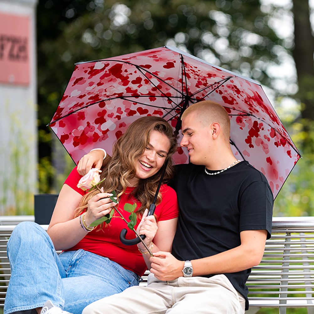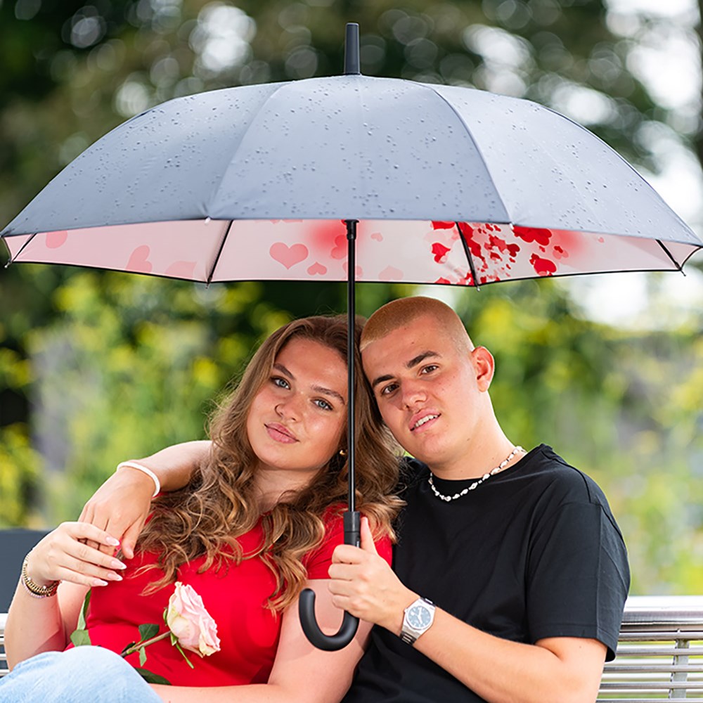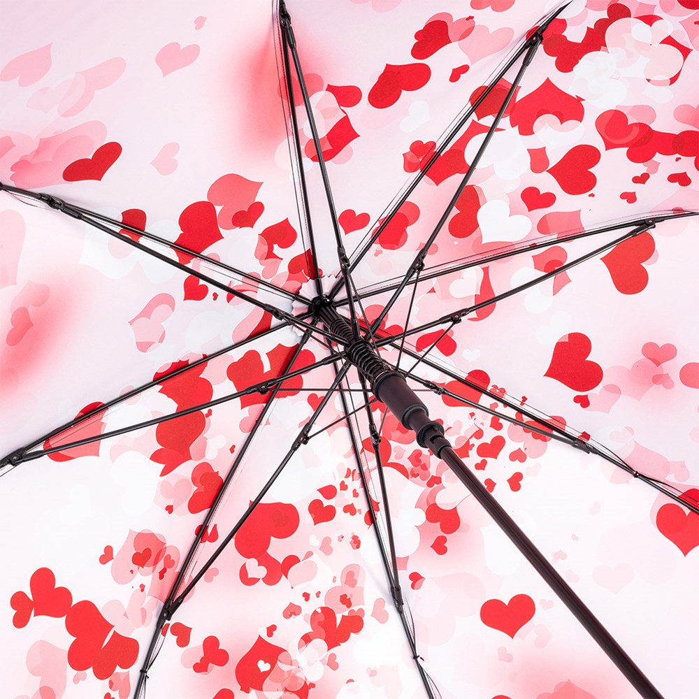 Neutral automatic regular umbrella with colourful print inside Convenient automatic function for quick opening, high-quality Windproof PLUS system for maximum frame flexibility in stormy conditions, flexible fibreglass ribs, externally coated cover with internal transfer print, Soft-Touch crook handle with integrated push-button and promotional labelling option, higher corrosion protection due to galvanized steel shaft. Some colours also available as pocket umbrellas (Art. 5593).