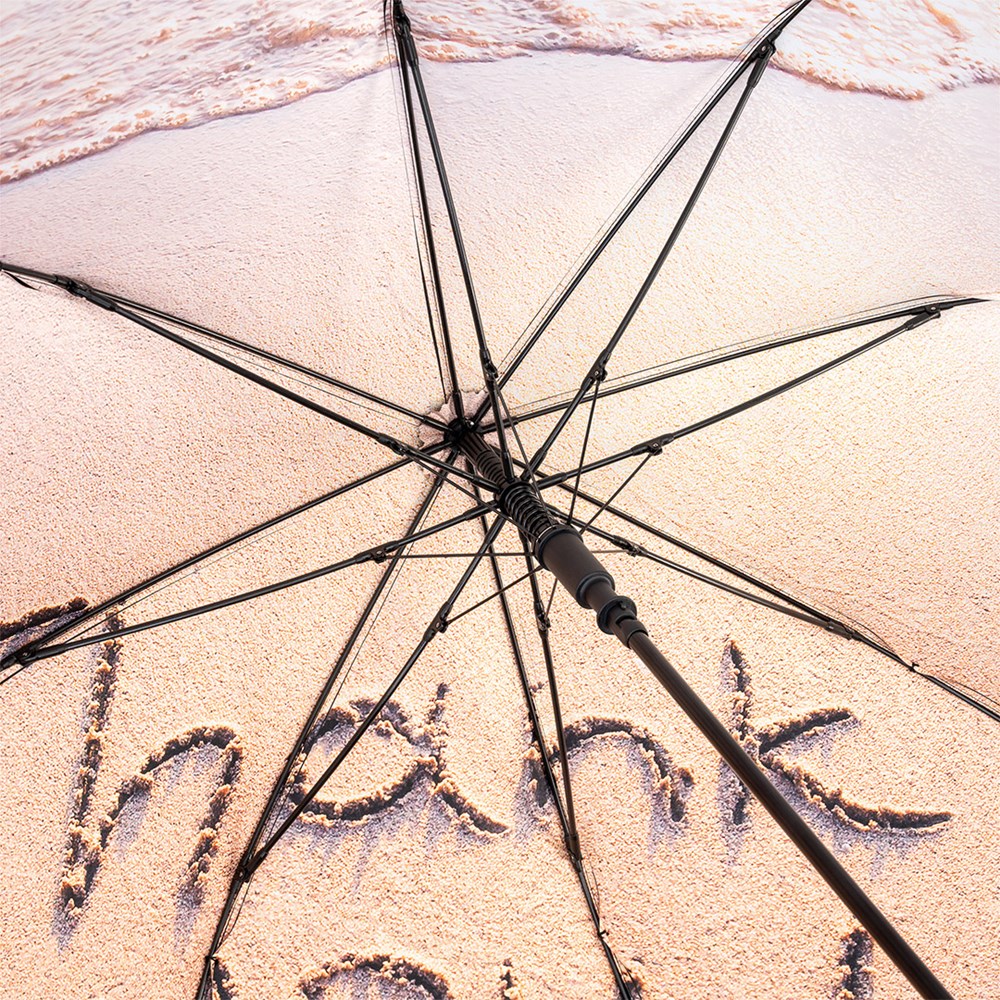 Neutral automatic regular umbrella with colourful print inside Convenient automatic function for quick opening, high-quality Windproof PLUS system for maximum frame flexibility in stormy conditions, flexible fibreglass ribs, externally coated cover with internal transfer print, Soft-Touch crook handle with integrated push-button and promotional labelling option, higher corrosion protection due to galvanized steel shaft. Some colours also available as pocket umbrellas (Art. 5593).