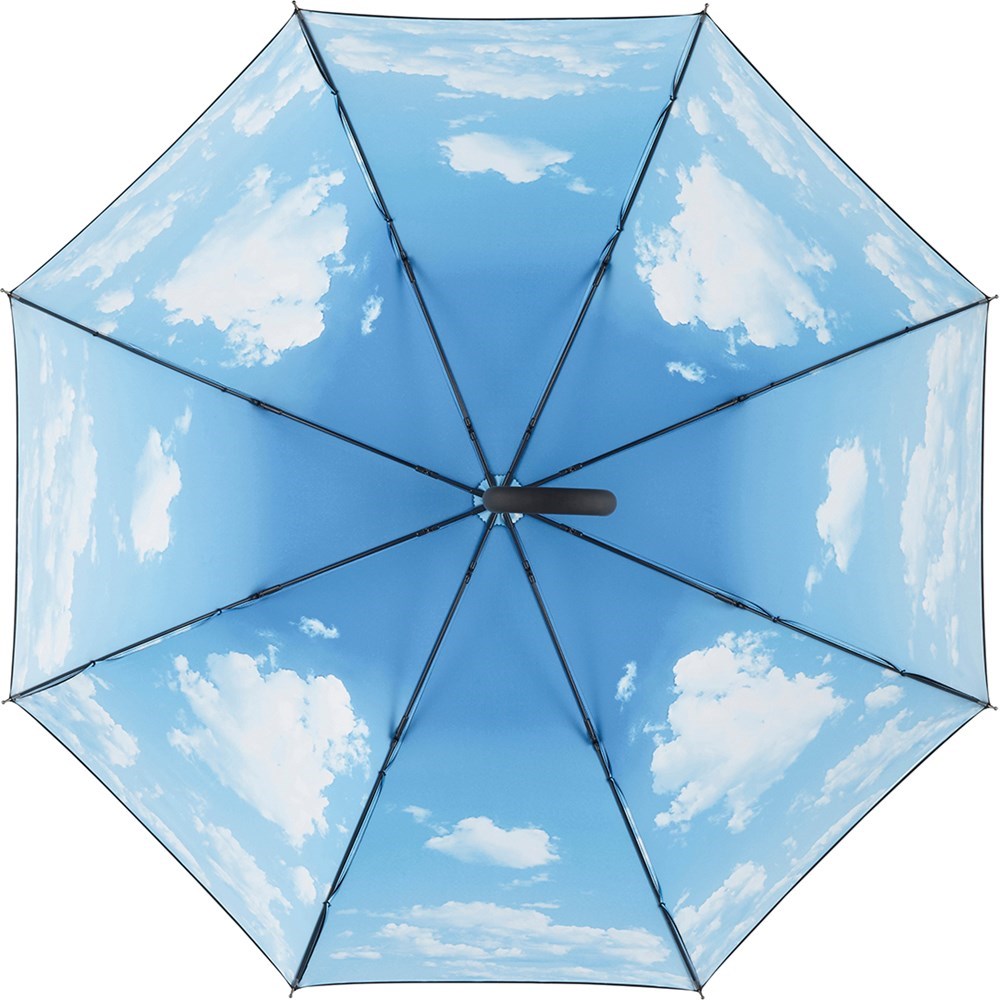 Neutral automatic regular umbrella with colourful print inside Convenient automatic function for quick opening, high-quality Windproof PLUS system for maximum frame flexibility in stormy conditions, flexible fibreglass ribs, externally coated cover with internal transfer print, Soft-Touch crook handle with integrated push-button and promotional labelling option, higher corrosion protection due to galvanized steel shaft. Some colours also available as pocket umbrellas (Art. 5593).