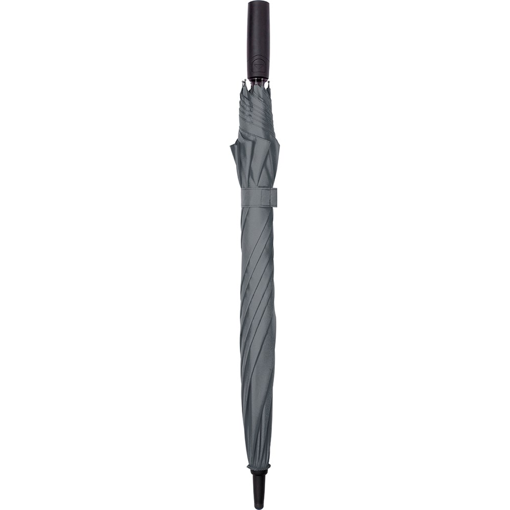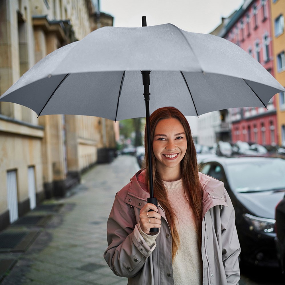 Attractively priced automatic regular umbrella with Windproof PLUS system Convenient automatic function for quick opening, high-quality Windproof PLUS system for maximum frame flexibility in stormy conditions, flexible fibreglass ribs, higher corrosion protection thanks to black galvanisation of the steel shaft, Soft-Feel handle with integrated pushbutton and promotional labelling option.