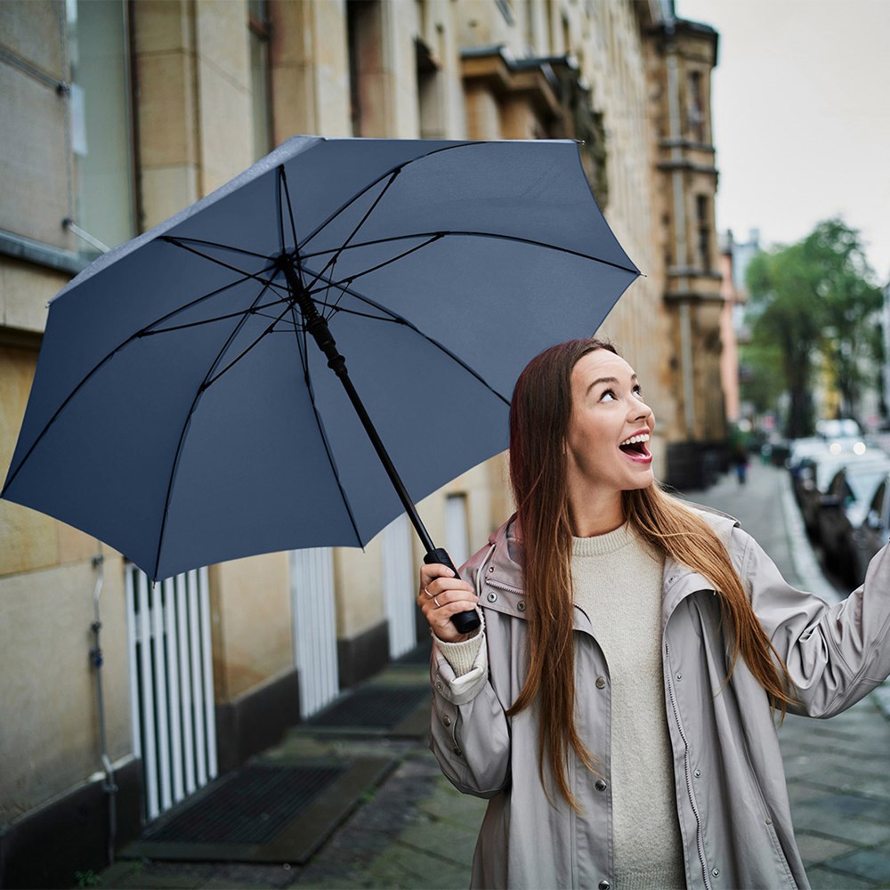 Attractively priced automatic regular umbrella with Windproof PLUS system Convenient automatic function for quick opening, high-quality Windproof PLUS system for maximum frame flexibility in stormy conditions, flexible fibreglass ribs, higher corrosion protection thanks to black galvanisation of the steel shaft, Soft-Feel handle with integrated pushbutton and promotional labelling option.