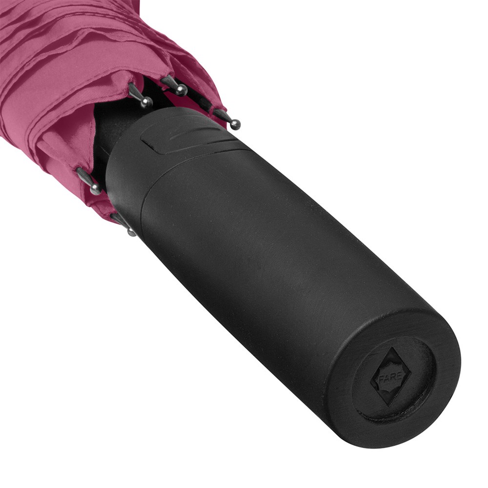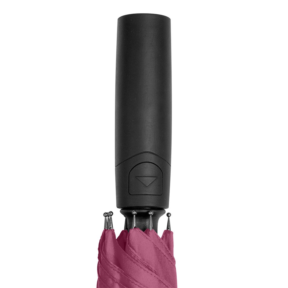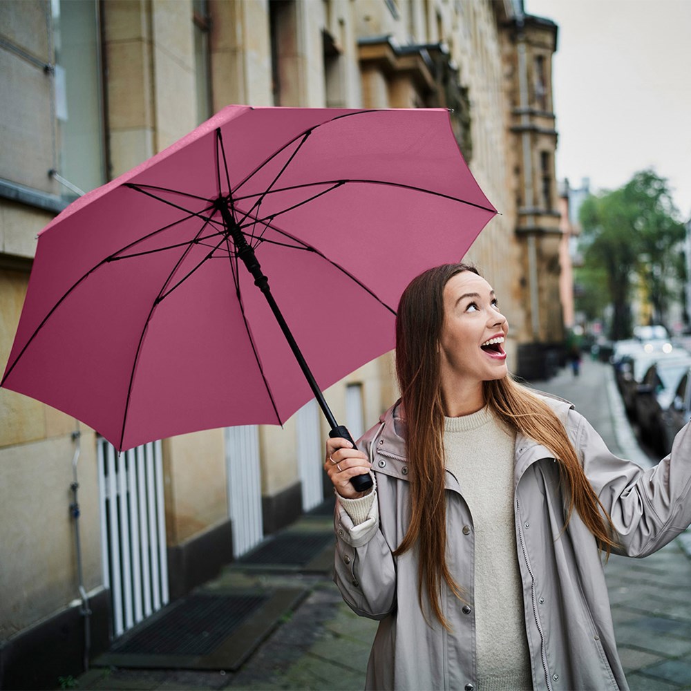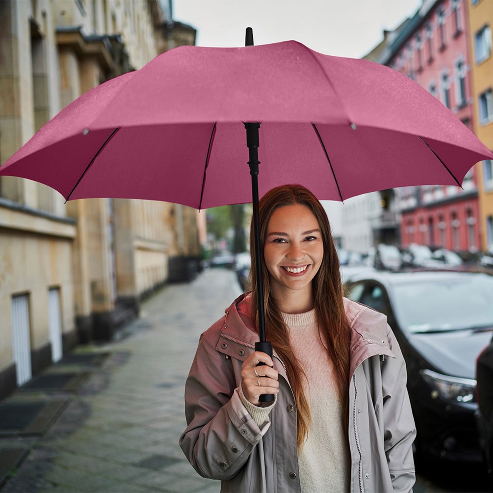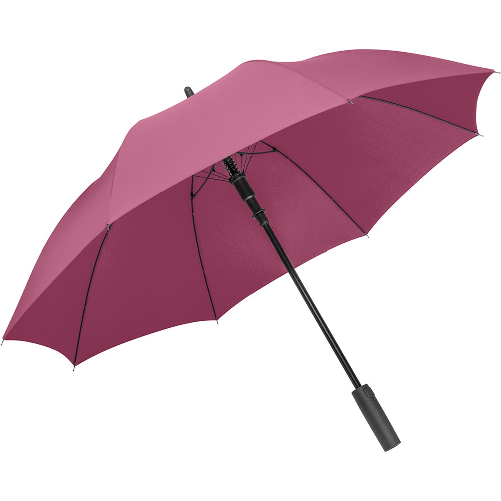 Attractively priced automatic regular umbrella with Windproof PLUS system Convenient automatic function for quick opening, high-quality Windproof PLUS system for maximum frame flexibility in stormy conditions, flexible fibreglass ribs, higher corrosion protection thanks to black galvanisation of the steel shaft, Soft-Feel handle with integrated pushbutton and promotional labelling option.