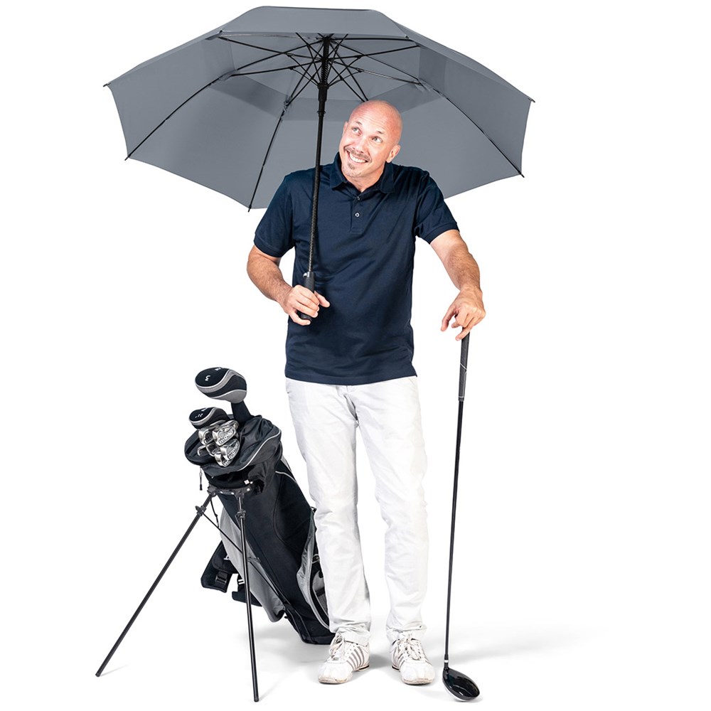 Exclusive automatic golf umbrella for two people with handle in golf design Convenient automatic function for quick opening, high-quality Windproof PLUS system for maximum frame flexibility in stormy conditions, sturdy fibreglass shaft, flexible fibreglass ribs, overlapping ventilation cover to regulate pressure in stronger gusts, cover with two closing straps for optimal fixation in closed state, exclusive Soft-Touch handle with golf ball dimpled surface, silver push-button and promotional labelling option, convenient carry case with shoulder strap, large, accommodating diameter