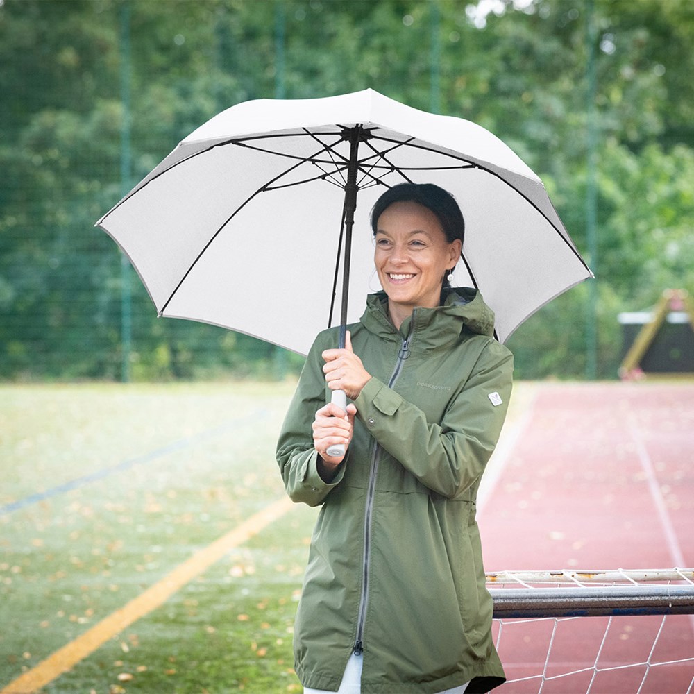 Striking automatic regular umbrella with trendy reflective piping Convenient automatic function for quick opening, high-quality Windproof PLUS system for maximum frame flexibility in stormy conditions, sturdy fibreglass shaft, flexible fibreglass ribs, cover with trendy reflective piping in silver, hand friendly Soft-Touch handle with promotional labelling option, Soft-Touch top