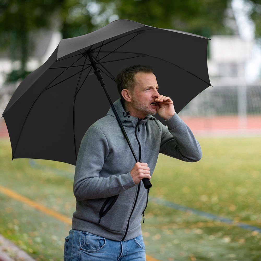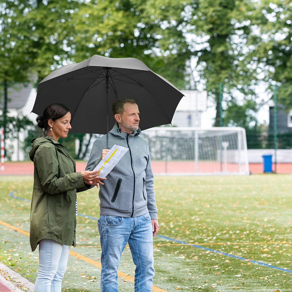 Convenient automatic golf umbrella for two people with hand friendly soft handle Convenient automatic function for quick opening, Windproof system for higher flexibility and stability in windy conditions, flexible fibreglass ribs, straight soft handle, higher corrosion protection due to galvanized steel shaft, large, accommodating diameter