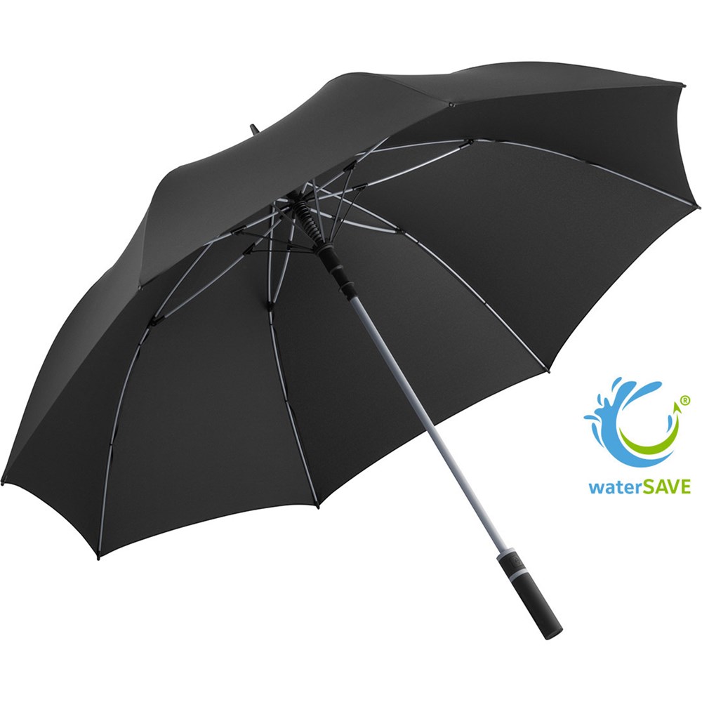 Stylish automatic golf umbrella for two people with coloured shaft and coloured elements Convenient automatic function for quick opening, high-quality Windproof PLUS system for maximum frame flexibility in stormy conditions, flexible fibreglass ribs, stable steel shaft with coloured plastic tube, polyester pongee material made of recycled plastics, eco-friendly thanks to original waterSAVE cover material, with waterSAVE® label on the closing strap, exclusive straight Soft-Feel handle with coloured handle rings and double promotional labelling option. Also available as mini umbrella (art. 5084, 5484, 5584) and as midsize umbrella (art. 4784).