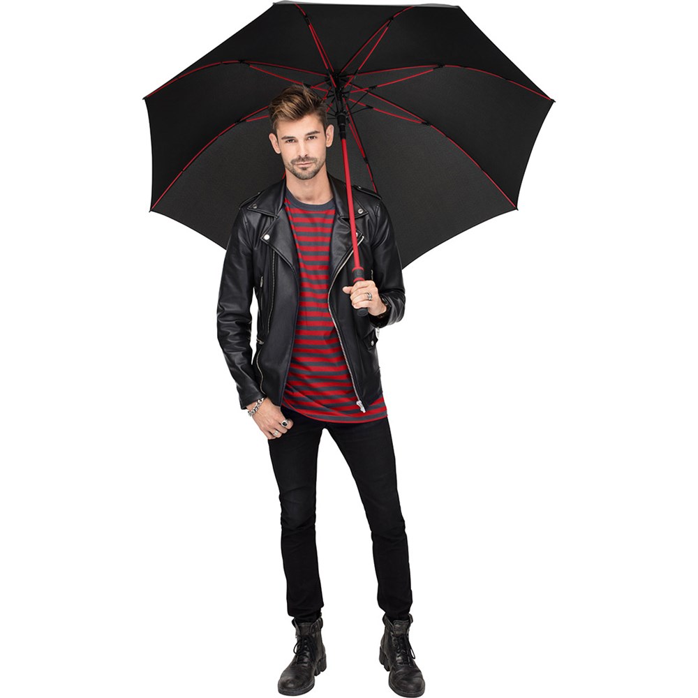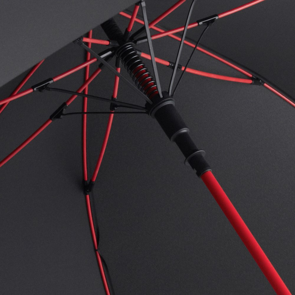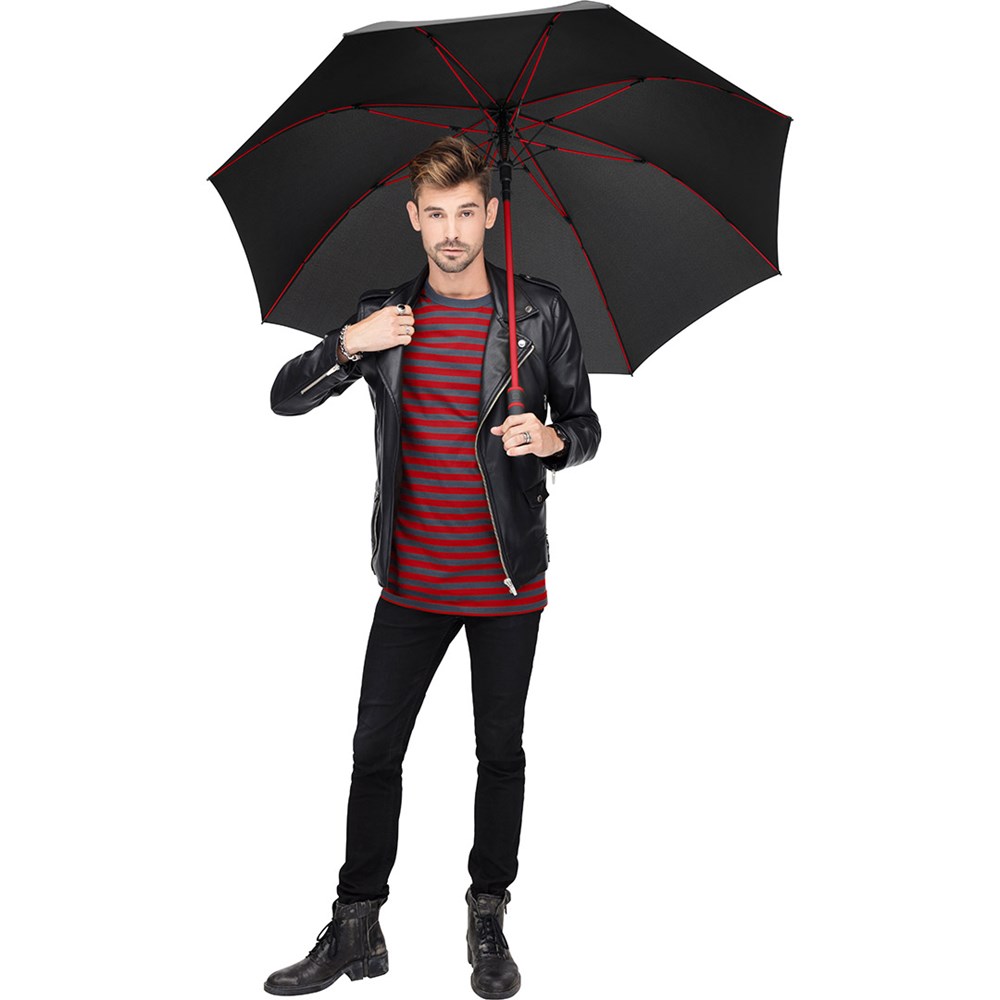 Stylish automatic golf umbrella for two people with coloured shaft and coloured elements Convenient automatic function for quick opening, high-quality Windproof PLUS system for maximum frame flexibility in stormy conditions, flexible fibreglass ribs, stable steel shaft with coloured plastic tube, polyester pongee material made of recycled plastics, eco-friendly thanks to original waterSAVE cover material, with waterSAVE® label on the closing strap, exclusive straight Soft-Feel handle with coloured handle rings and double promotional labelling option. Also available as mini umbrella (art. 5084, 5484, 5584) and as midsize umbrella (art. 4784).