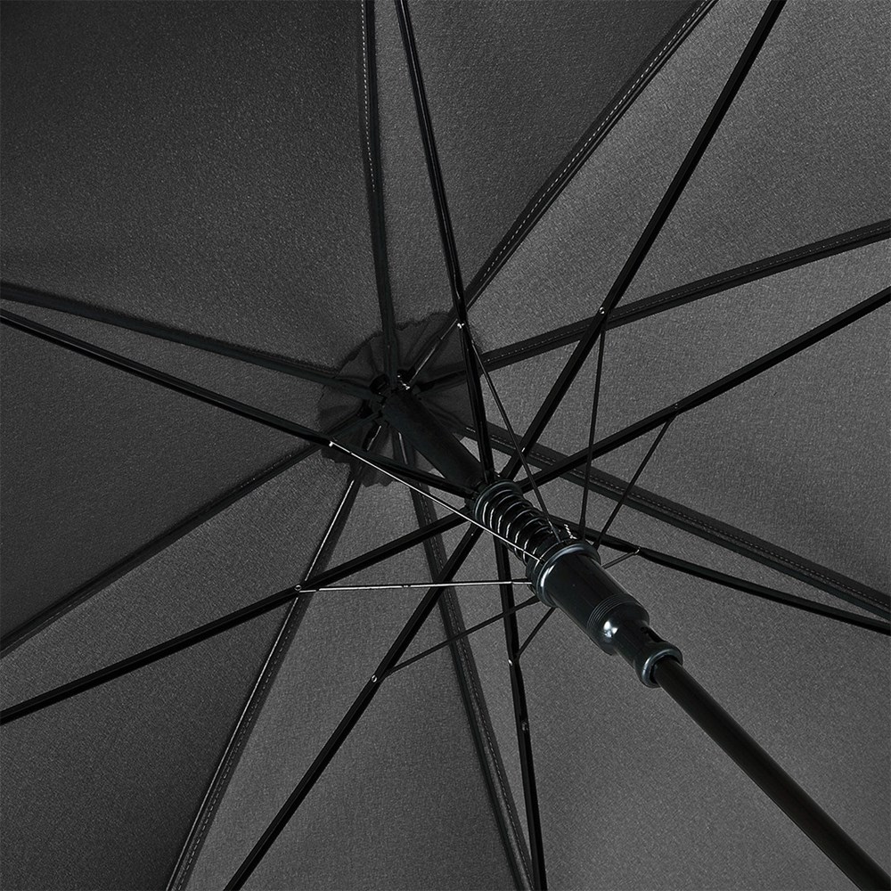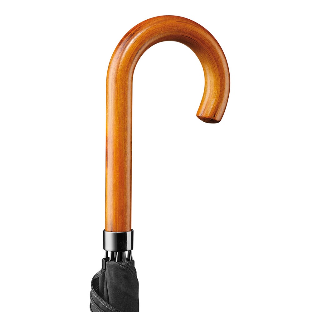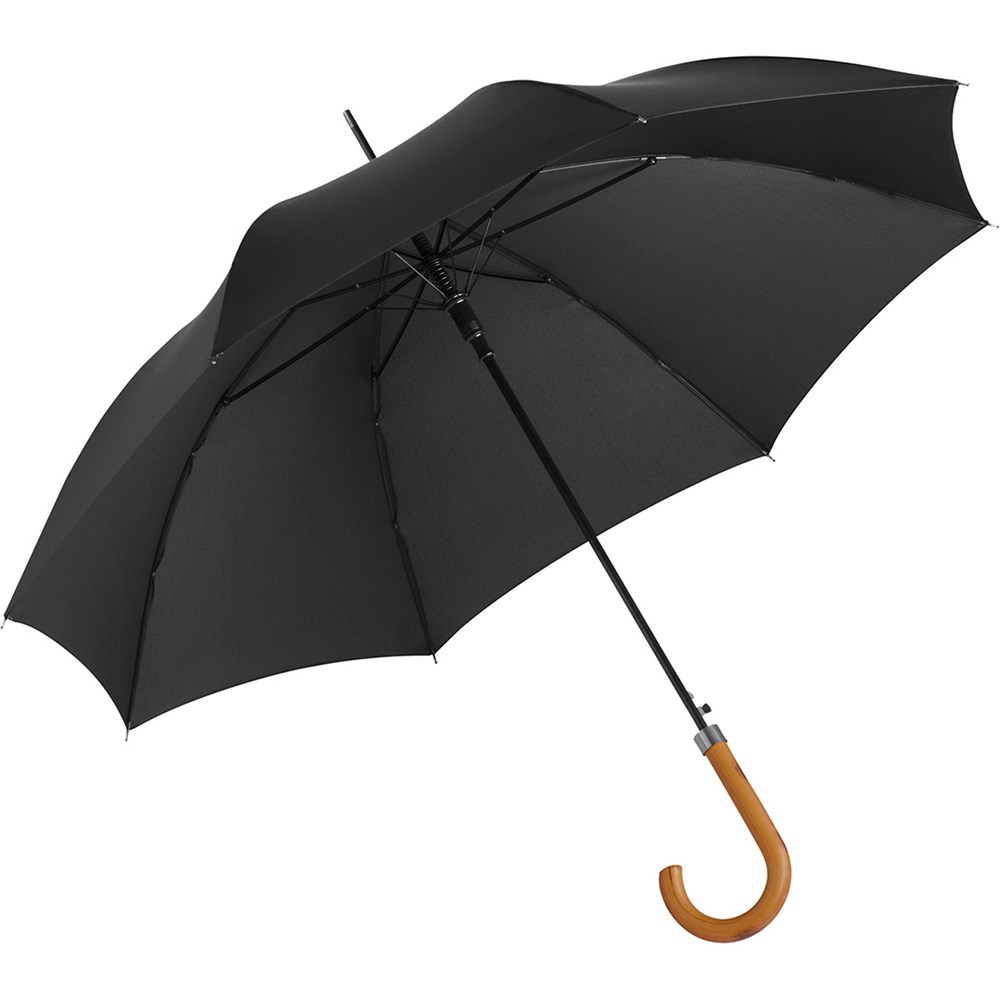 Attractively priced automatic regular umbrella with burned wooden crook handle Convenient automatic function for quick opening, Windproof system for higher frame flexibility and stability in windy conditions, flexible fibreglass ribs, handle with laser-competent handle ring, higher corrosion protection due to galvanized steel shaft