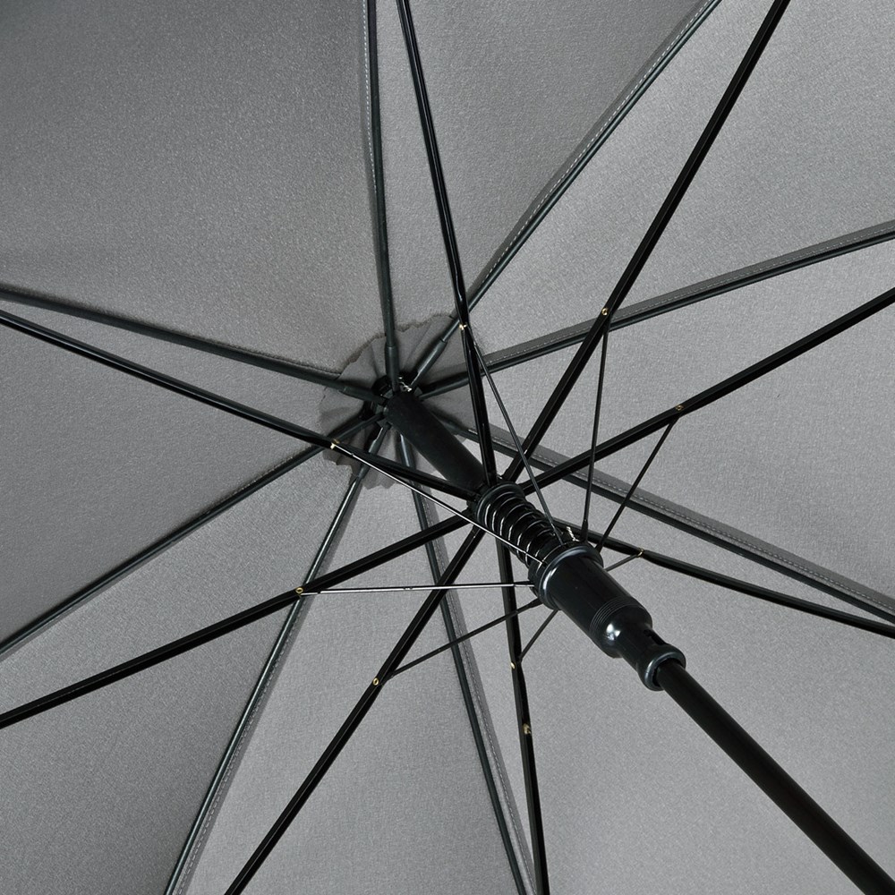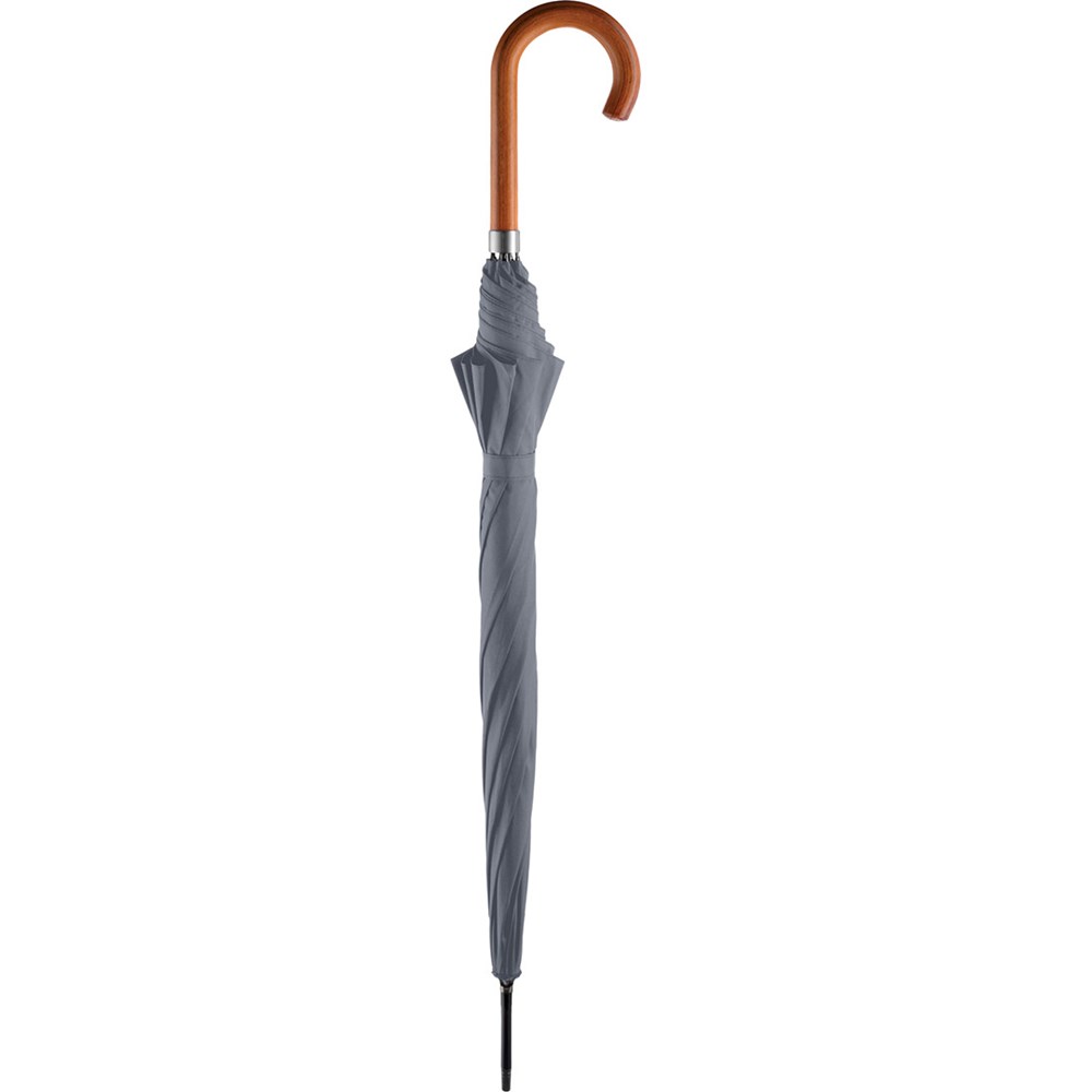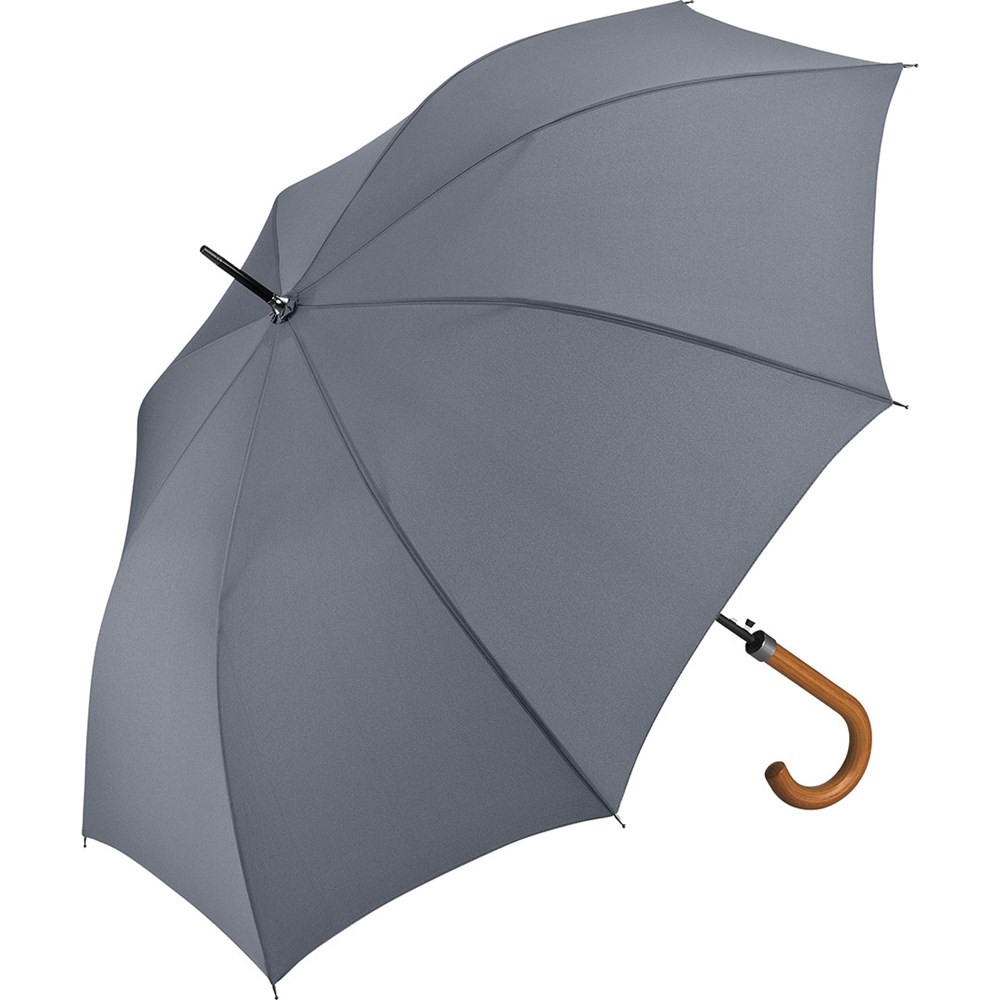 Attractively priced automatic regular umbrella with burned wooden crook handle Convenient automatic function for quick opening, Windproof system for higher frame flexibility and stability in windy conditions, flexible fibreglass ribs, handle with laser-competent handle ring, higher corrosion protection due to galvanized steel shaft