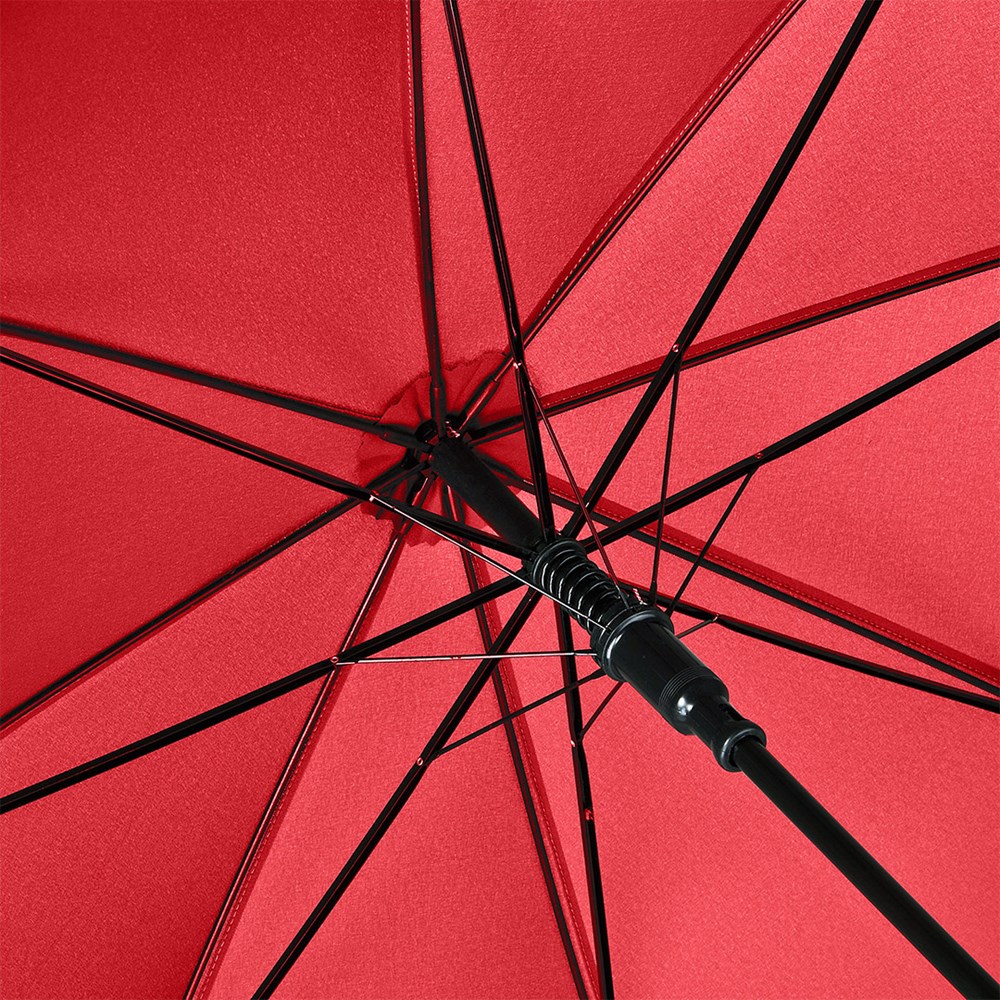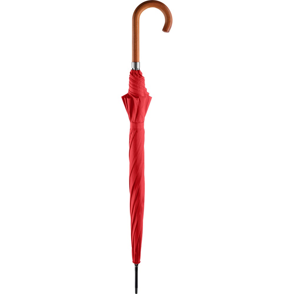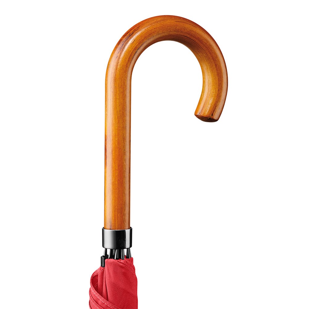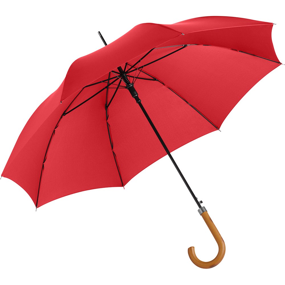 Attractively priced automatic regular umbrella with burned wooden crook handle Convenient automatic function for quick opening, Windproof system for higher frame flexibility and stability in windy conditions, flexible fibreglass ribs, handle with laser-competent handle ring, higher corrosion protection due to galvanized steel shaft