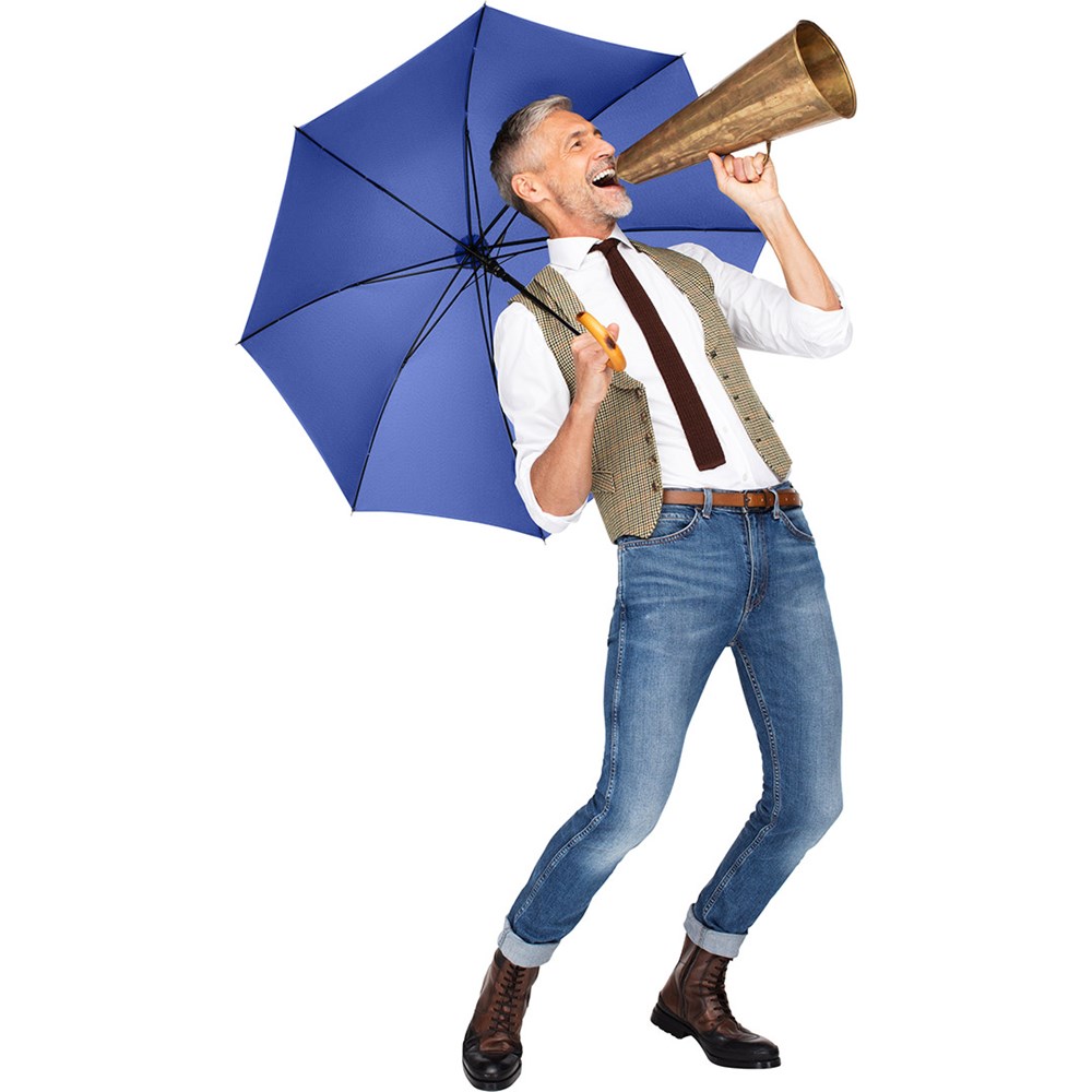 Attractively priced automatic regular umbrella with burned wooden crook handle Convenient automatic function for quick opening, Windproof system for higher frame flexibility and stability in windy conditions, flexible fibreglass ribs, handle with laser-competent handle ring, higher corrosion protection due to galvanized steel shaft