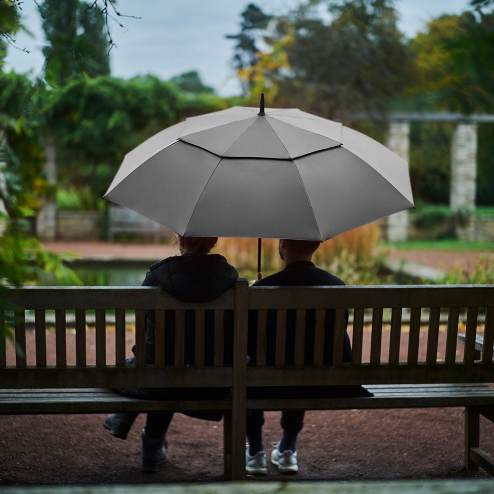 Exclusive automatic golf umbrella for two people with drop motif on the fibreglass shaft Convenient automatic function for quick opening, high-quality Windproof PLUS system for maximum frame flexibility in stormy conditions, flexible fibreglass ribs, stable fibreglass shaft with drop motif, polyester Pongee waterSAVE® cover material made of recycled plastics and dyed using a water-saving process, with waterSAVE® label on the closing strap (with new deliveries), cover coated on the inside, overlapping ventilation cover to regulate pressure in stronger gusts, exclusive soft handle with coloured handle rings, integrated pushbutton and promotional labelling option, drop motif and handle rings colour-coordinated with the cover.