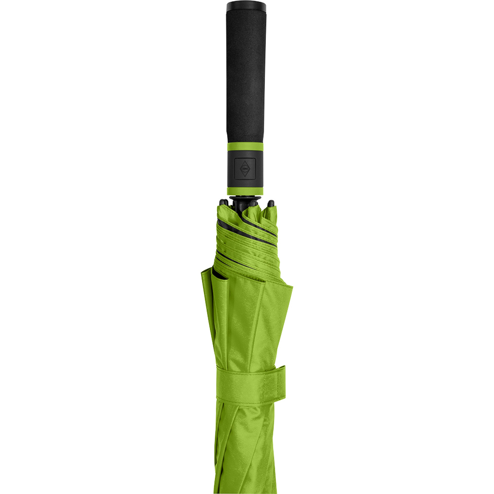 Exclusive automatic golf umbrella for two people with drop motif on the fibreglass shaft Convenient automatic function for quick opening, high-quality Windproof PLUS system for maximum frame flexibility in stormy conditions, flexible fibreglass ribs, stable fibreglass shaft with drop motif, polyester Pongee waterSAVE® cover material made of recycled plastics and dyed using a water-saving process, with waterSAVE® label on the closing strap (with new deliveries), cover coated on the inside, overlapping ventilation cover to regulate pressure in stronger gusts, exclusive soft handle with coloured handle rings, integrated pushbutton and promotional labelling option, drop motif and handle rings colour-coordinated with the cover.