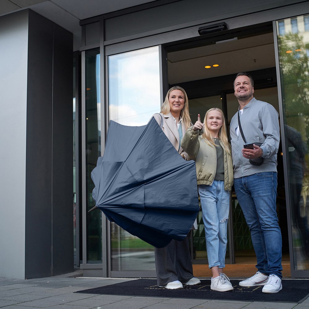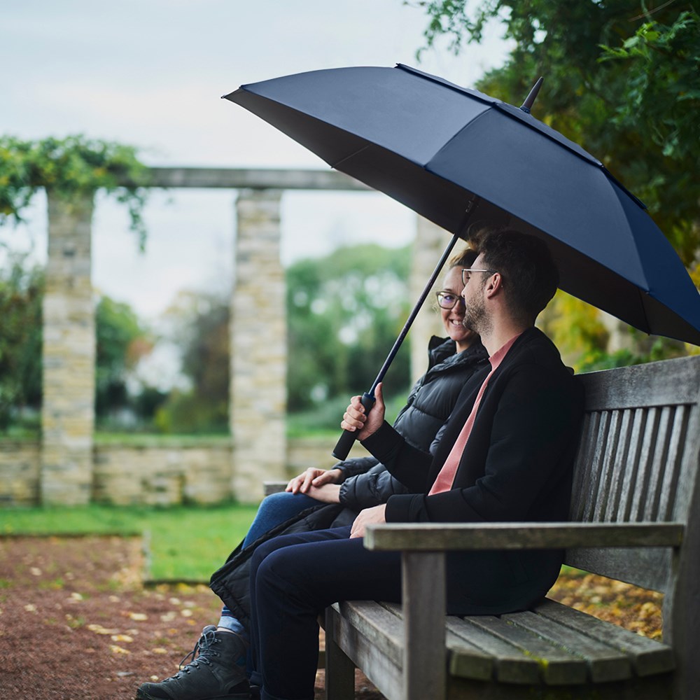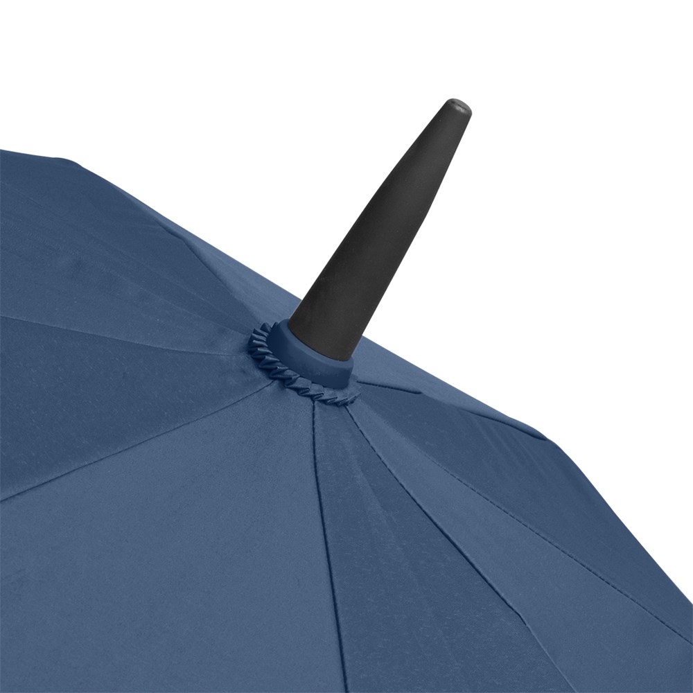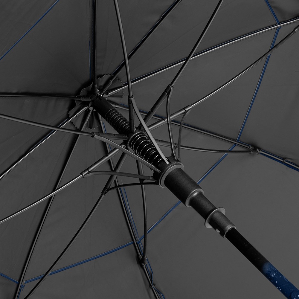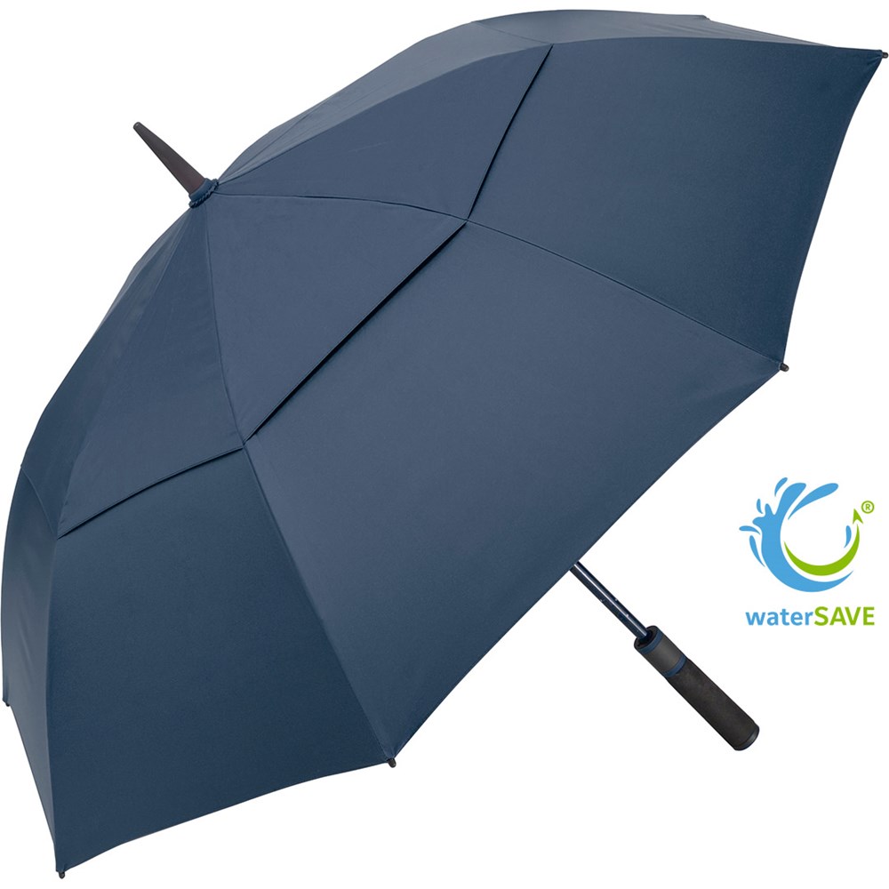 Exclusive automatic golf umbrella for two people with drop motif on the fibreglass shaft Convenient automatic function for quick opening, high-quality Windproof PLUS system for maximum frame flexibility in stormy conditions, flexible fibreglass ribs, stable fibreglass shaft with drop motif, polyester Pongee waterSAVE® cover material made of recycled plastics and dyed using a water-saving process, with waterSAVE® label on the closing strap (with new deliveries), cover coated on the inside, overlapping ventilation cover to regulate pressure in stronger gusts, exclusive soft handle with coloured handle rings, integrated pushbutton and promotional labelling option, drop motif and handle rings colour-coordinated with the cover.