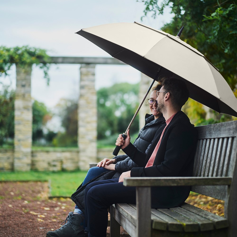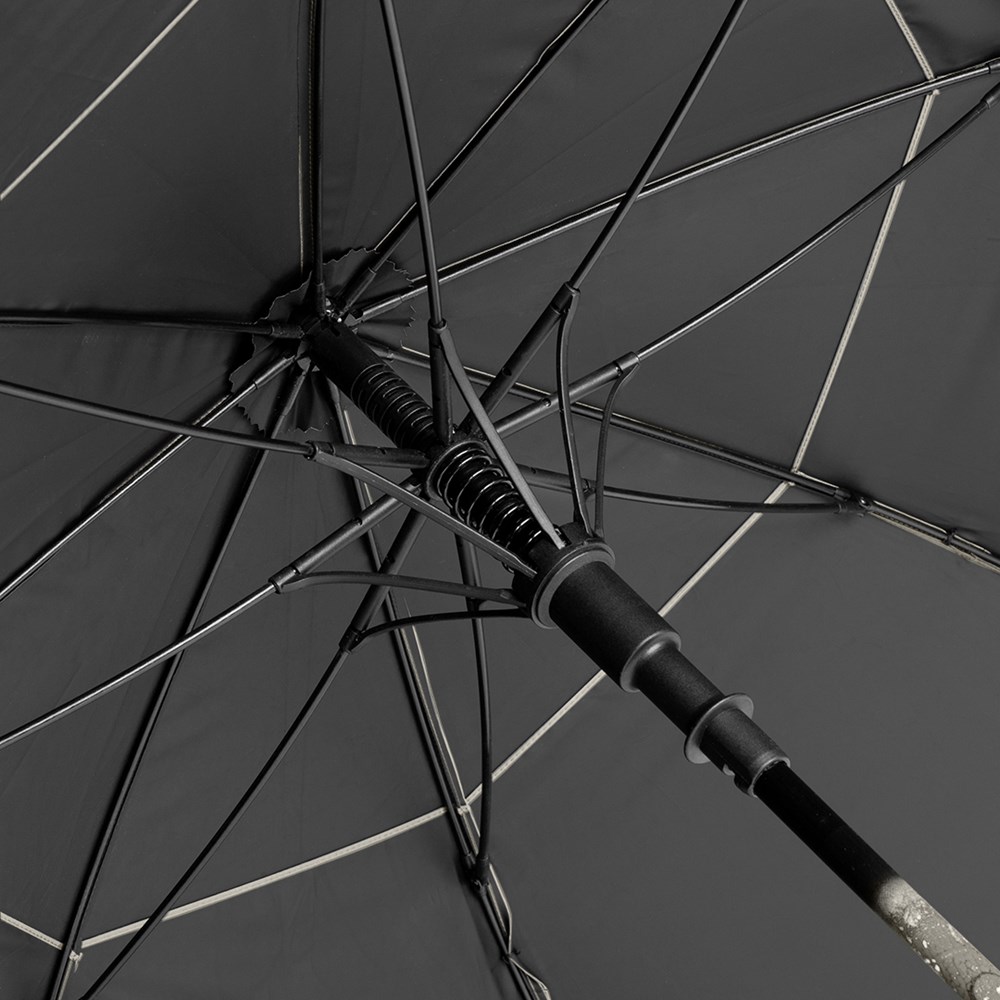 Exclusive automatic golf umbrella for two people with drop motif on the fibreglass shaft Convenient automatic function for quick opening, high-quality Windproof PLUS system for maximum frame flexibility in stormy conditions, flexible fibreglass ribs, stable fibreglass shaft with drop motif, polyester Pongee waterSAVE® cover material made of recycled plastics and dyed using a water-saving process, with waterSAVE® label on the closing strap (with new deliveries), cover coated on the inside, overlapping ventilation cover to regulate pressure in stronger gusts, exclusive soft handle with coloured handle rings, integrated pushbutton and promotional labelling option, drop motif and handle rings colour-coordinated with the cover.