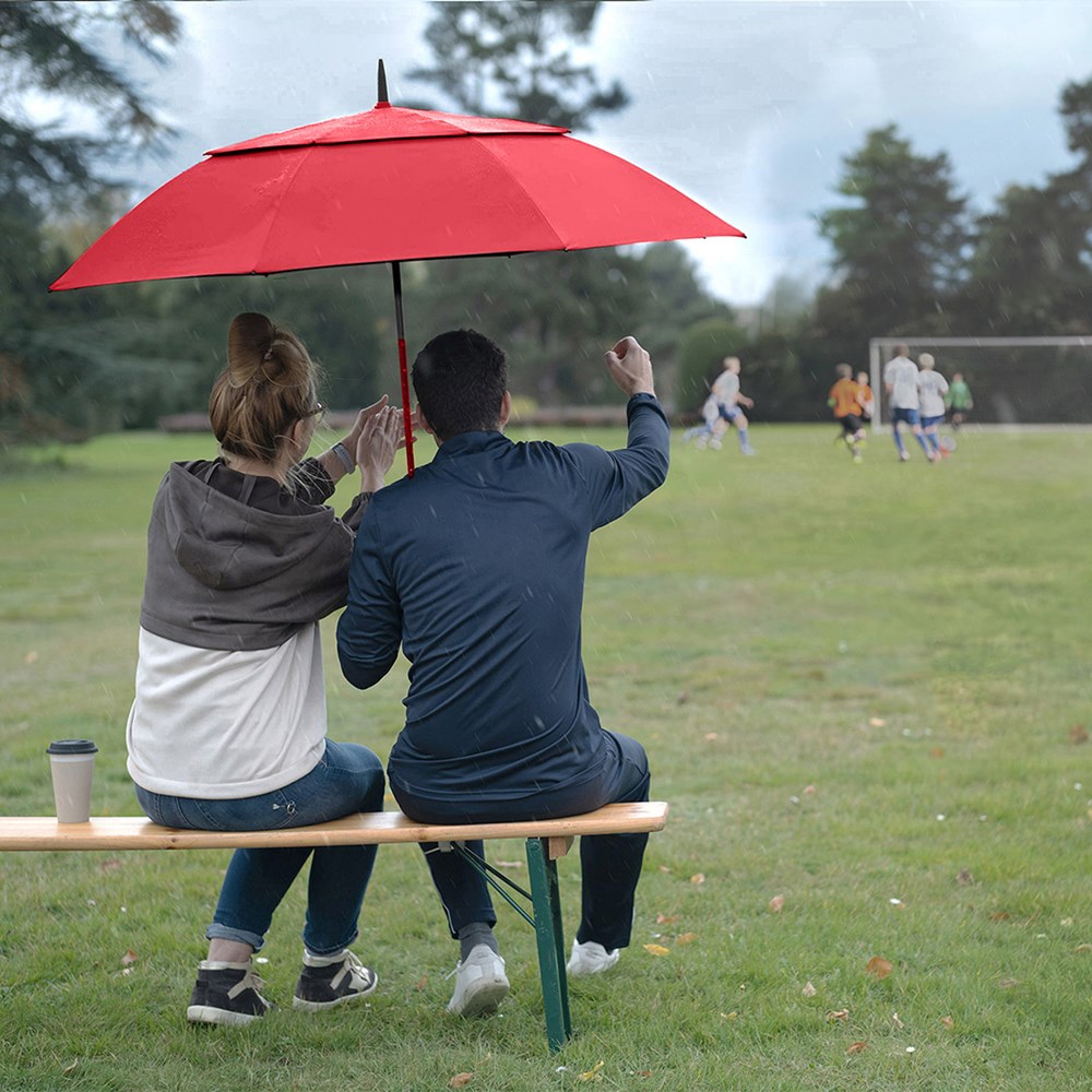 Exclusive automatic golf umbrella for two people with drop motif on the fibreglass shaft Convenient automatic function for quick opening, high-quality Windproof PLUS system for maximum frame flexibility in stormy conditions, flexible fibreglass ribs, stable fibreglass shaft with drop motif, polyester Pongee waterSAVE® cover material made of recycled plastics and dyed using a water-saving process, with waterSAVE® label on the closing strap (with new deliveries), cover coated on the inside, overlapping ventilation cover to regulate pressure in stronger gusts, exclusive soft handle with coloured handle rings, integrated pushbutton and promotional labelling option, drop motif and handle rings colour-coordinated with the cover.