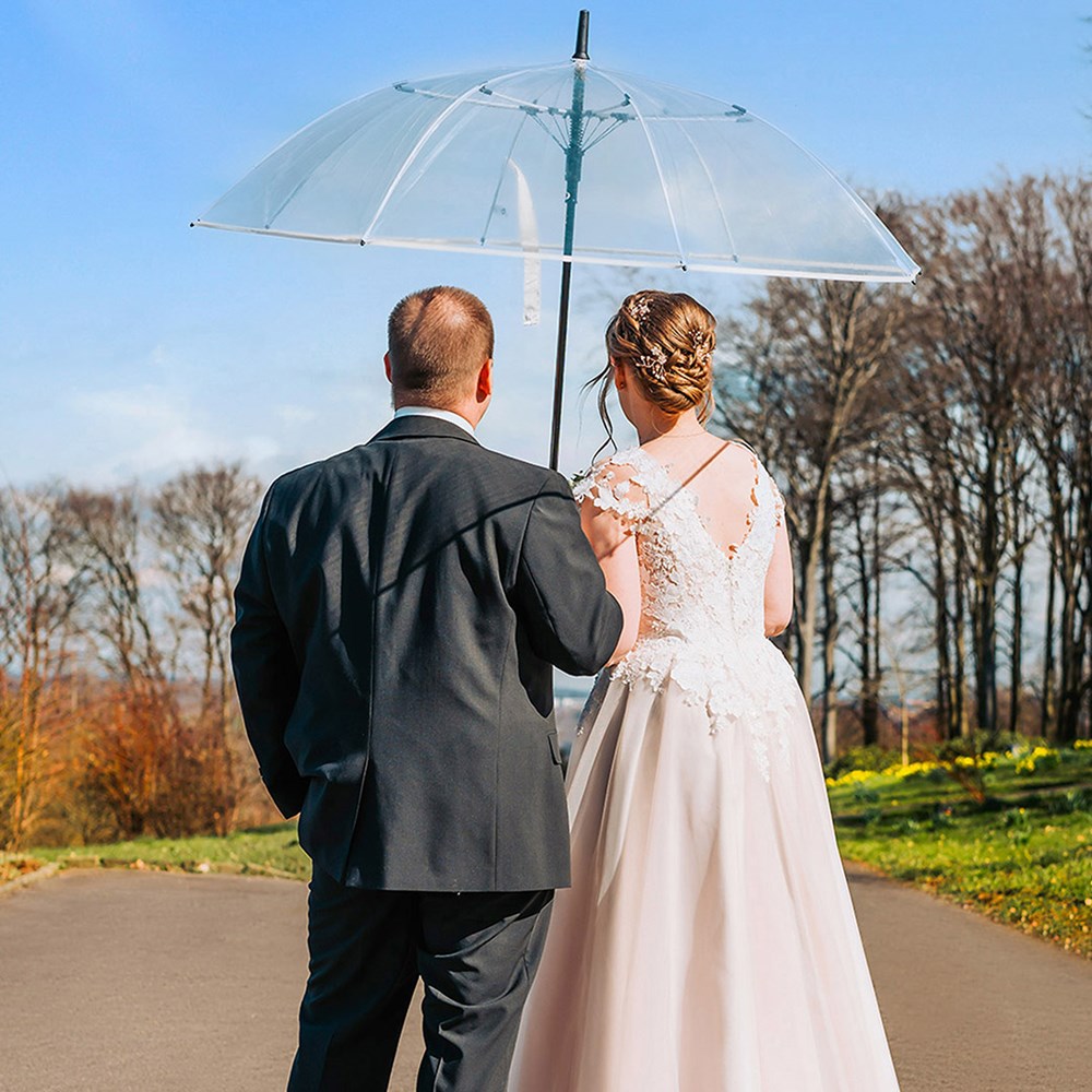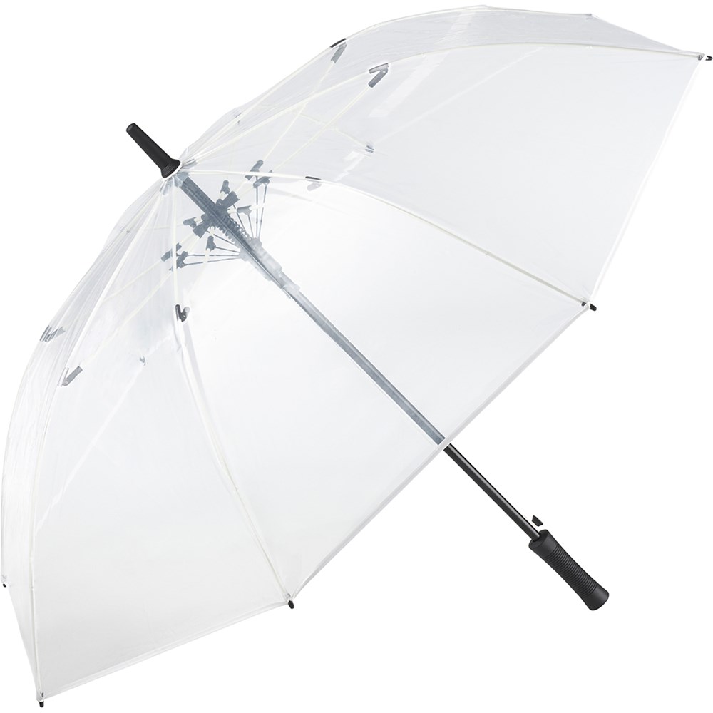 Attractive automatic golf umbrella for two people with transparent cover and coloured details Convenient automatic function for quick opening, high-quality Windproof PLUS system for maximum frame flexibility in stormy conditions, flexible fibreglass ribs, colour-coordinated design elements, straight matt black plastic handle with promotional labelling option, higher corrosion protection due to galvanized steel shaft