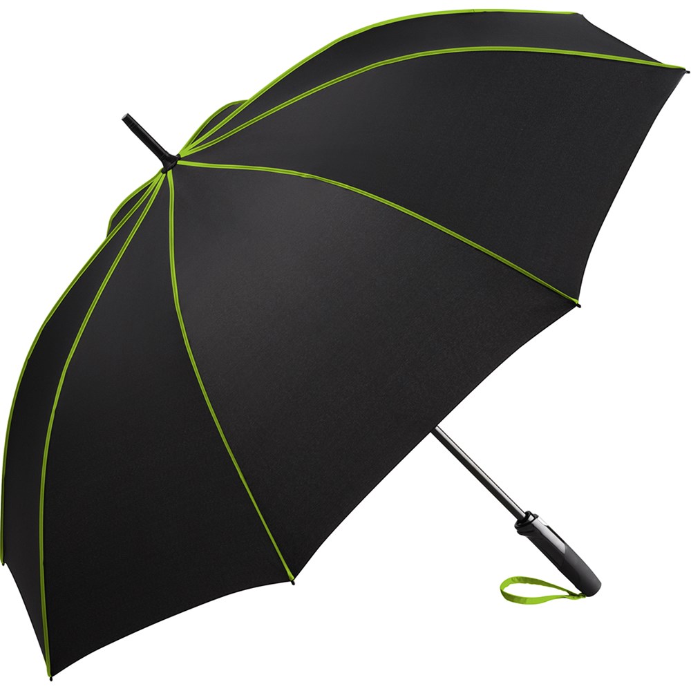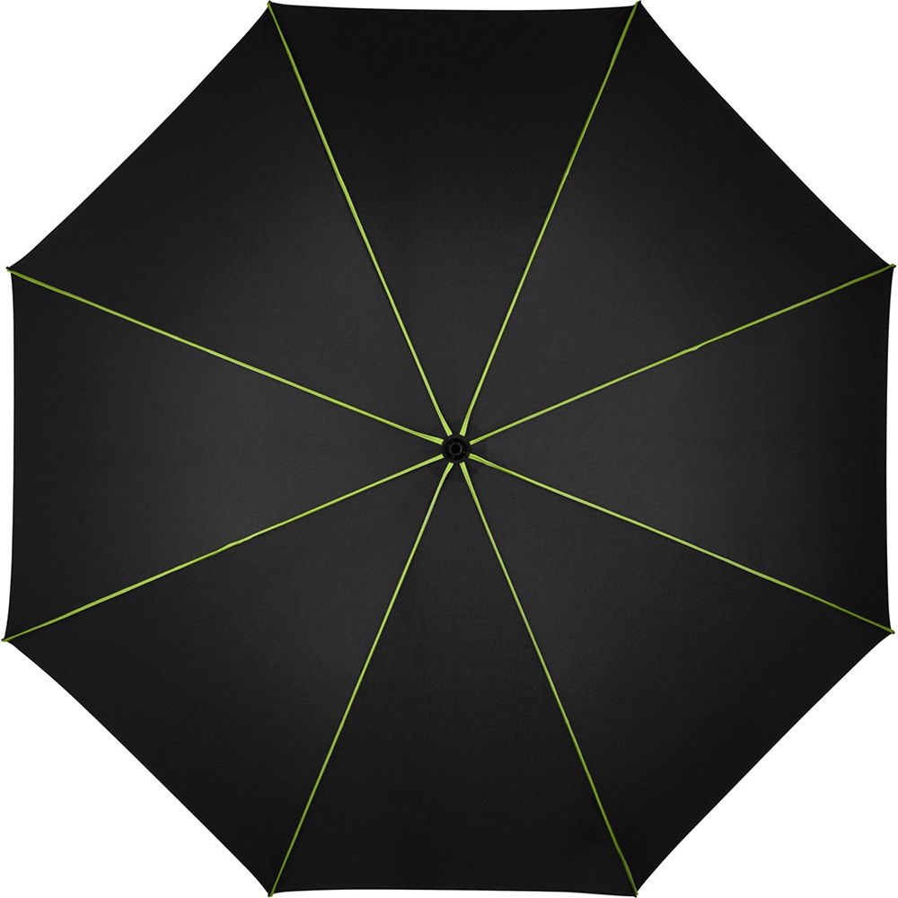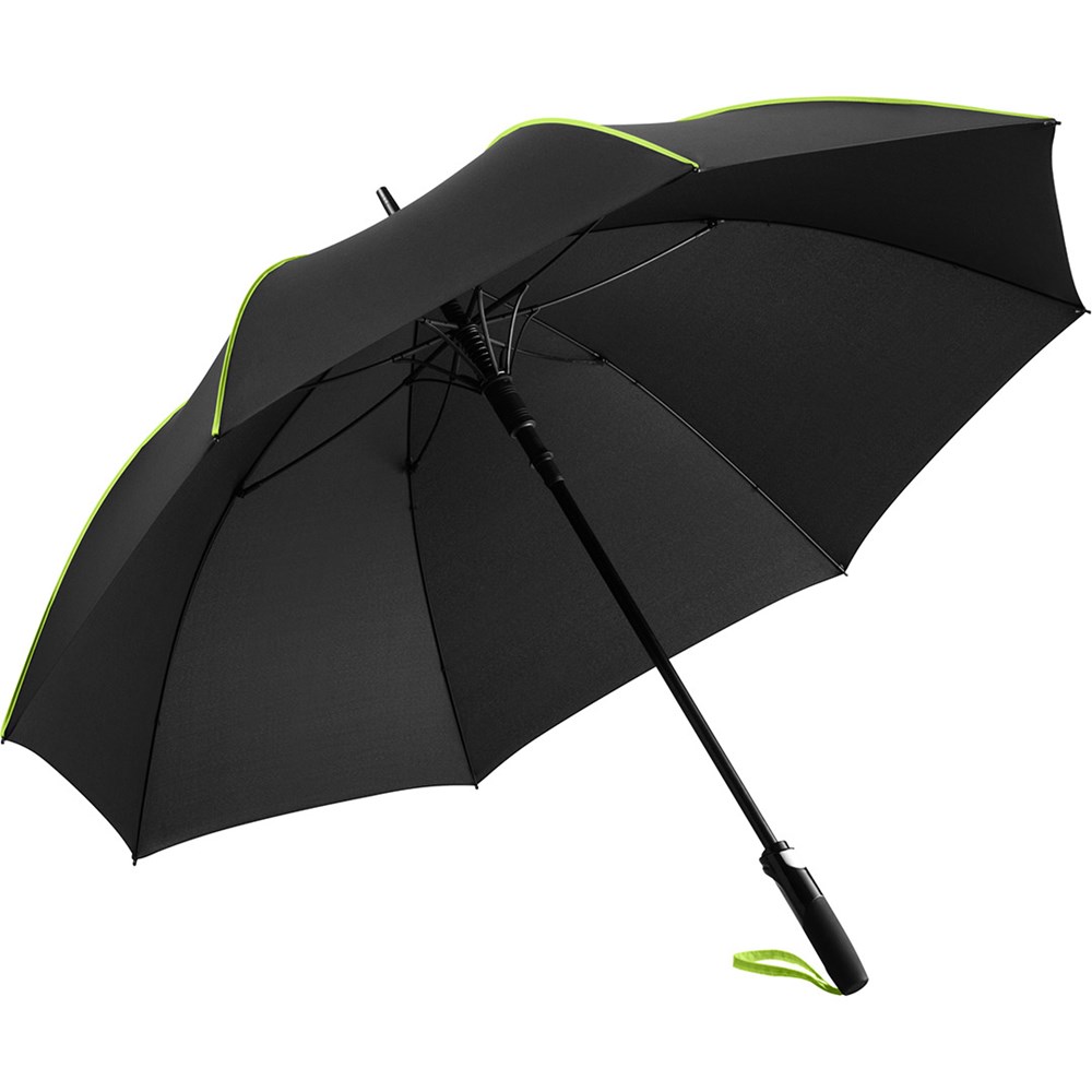 Stylish automatic umbrella in medium size with coloured highlights Convenient automatic function for quick opening, high-quality Windproof PLUS system for maximum frame flexibility in stormy conditions, flexible fibreglass ribs, striking cover decoration with coloured panel seam pipings, matt/shiny contrasting Soft-Touch handle with integrated push-button and promotional labelling option, coloured handle strap, higher corrosion protection due to black galvanisation of the steel shaft. Also available as mini umbrella (art. 5639).