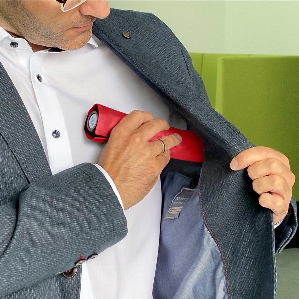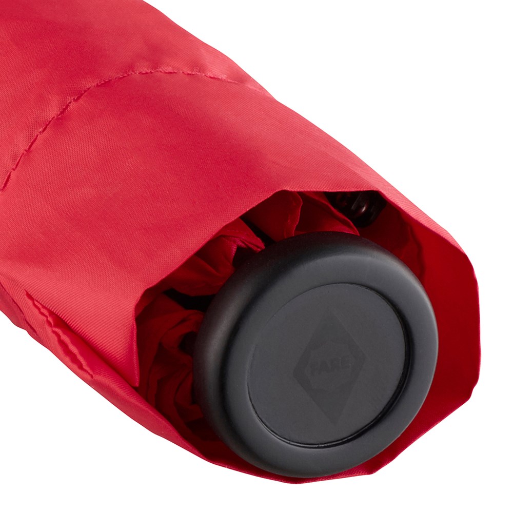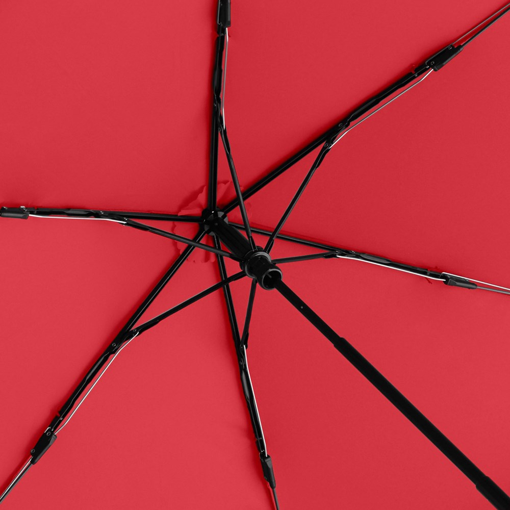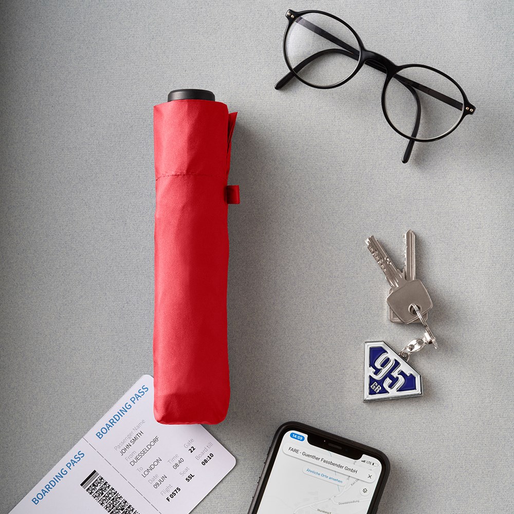 Filigree manual opening mini pocket umbrella with ultra-lightweight construction Easy to handle thanks to sliding safety runner, high-quality Windproof PLUS system for maximum frame flexibility in stormy conditions, black aluminium shaft, polyester pongee cover material made of recycled plastics, extra lightweight cover, dull black plastic handle made from recycled ABS (rABS) with promotional labelling option, suitable for handbag through ultra-light weight and compact size