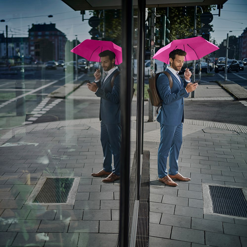 Filigree manual opening mini pocket umbrella with ultra-lightweight construction Easy to handle thanks to sliding safety runner, high-quality Windproof PLUS system for maximum frame flexibility in stormy conditions, black aluminium shaft, polyester pongee cover material made of recycled plastics, extra lightweight cover, dull black plastic handle made from recycled ABS (rABS) with promotional labelling option, suitable for handbag through ultra-light weight and compact size