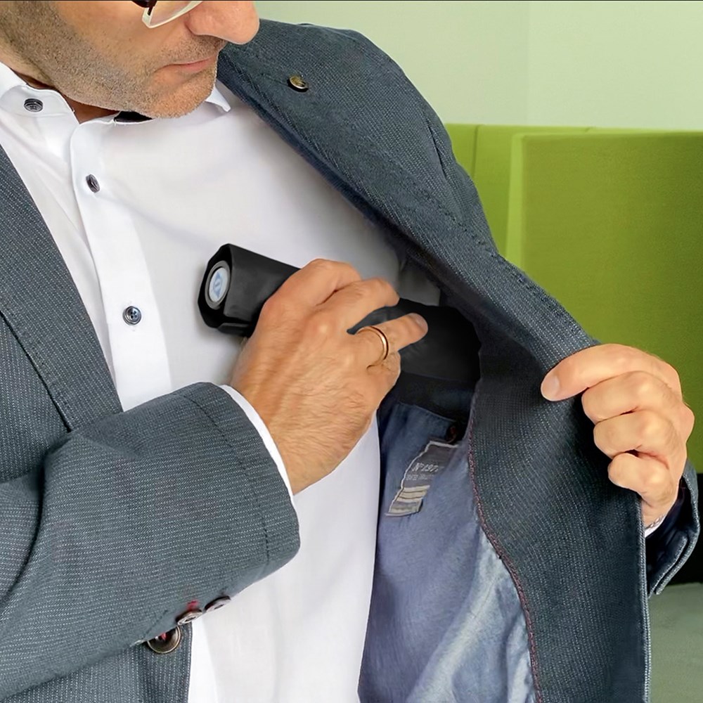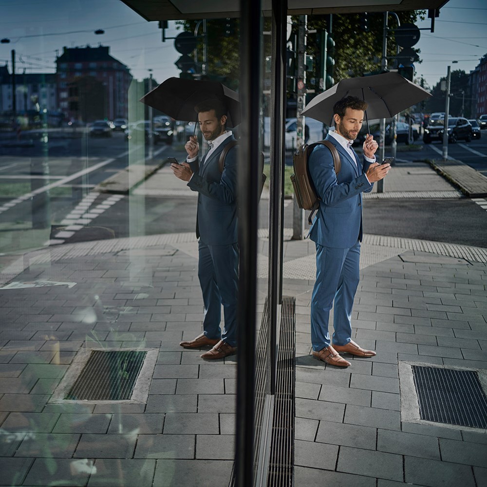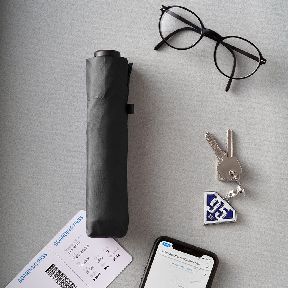 Filigree manual opening mini pocket umbrella with ultra-lightweight construction Easy to handle thanks to sliding safety runner, high-quality Windproof PLUS system for maximum frame flexibility in stormy conditions, black aluminium shaft, polyester pongee cover material made of recycled plastics, extra lightweight cover, dull black plastic handle made from recycled ABS (rABS) with promotional labelling option, suitable for handbag through ultra-light weight and compact size