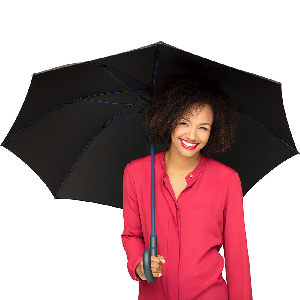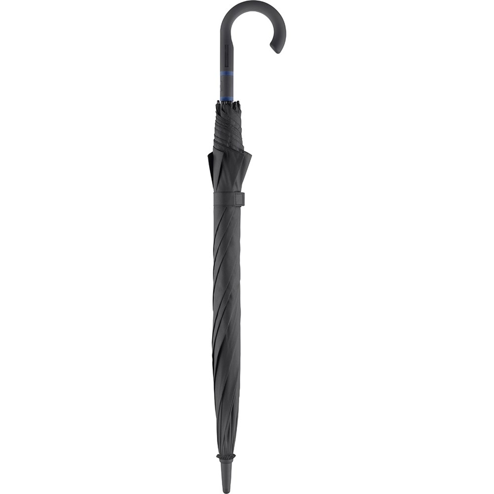 Stylish automatic umbrella in medium size with coloured shaft and coloured ribs Convenient automatic function for quick opening, high-quality Windproof PLUS system for maximum frame flexibility in stormy conditions, flexible fibreglass ribs, stable steel shaft with coloured plastic tube, polyester pongee material made of recycled plastics, eco-friendly thanks to original waterSAVE cover material, with waterSAVE® label on the closing strap, shapely Soft-Feel crook handle with colored handle rings, integrated push-button and promotional labelling option. Also available as mini umbrella (art. 5084, 5484, 5584) and as golf umbrella (art. 2384). Awarded with Promotional Gift Award 2016.