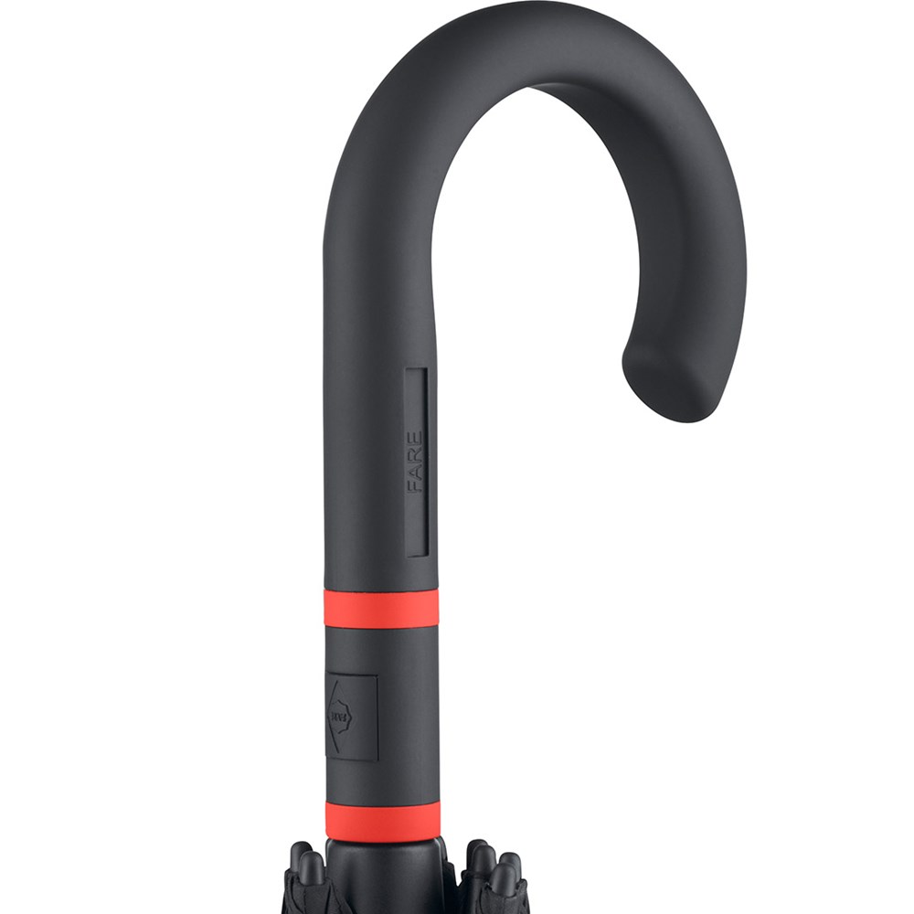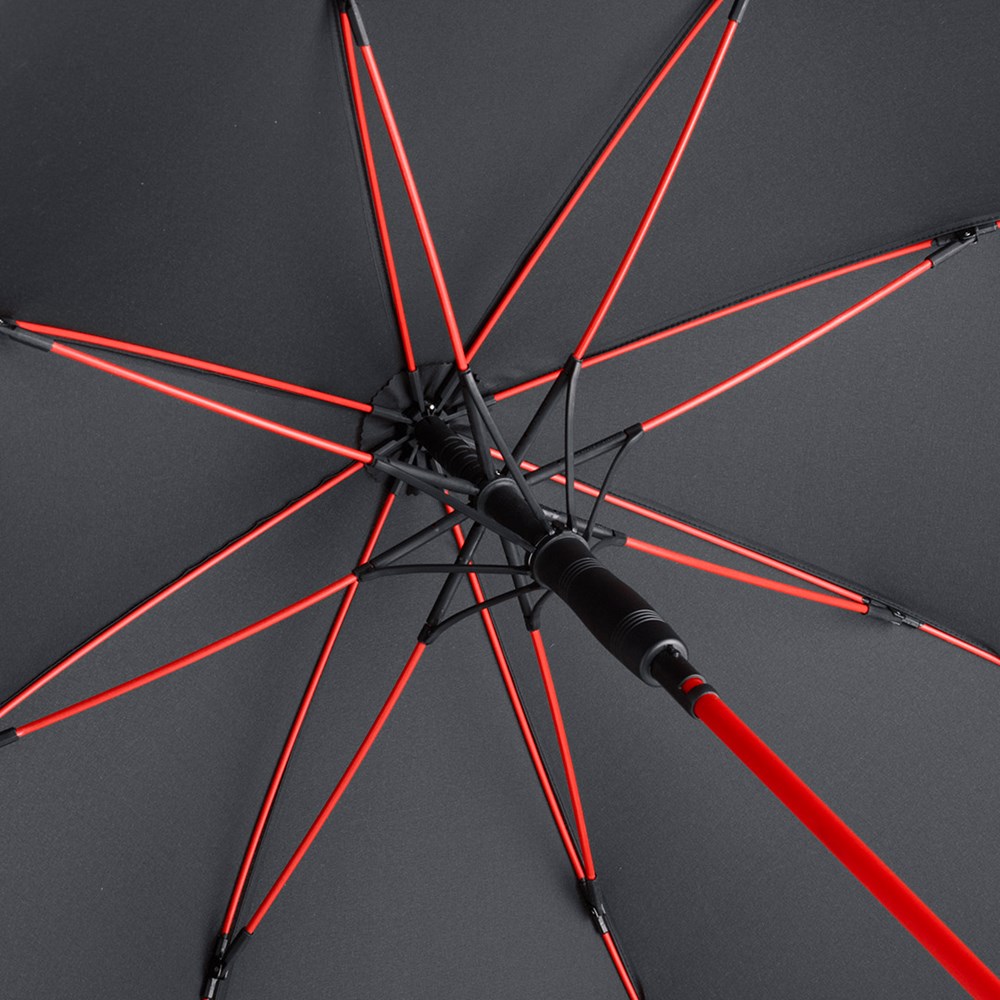 Stylish automatic umbrella in medium size with coloured shaft and coloured ribs Convenient automatic function for quick opening, high-quality Windproof PLUS system for maximum frame flexibility in stormy conditions, flexible fibreglass ribs, stable steel shaft with coloured plastic tube, polyester pongee material made of recycled plastics, eco-friendly thanks to original waterSAVE cover material, with waterSAVE® label on the closing strap, shapely Soft-Feel crook handle with colored handle rings, integrated push-button and promotional labelling option. Also available as mini umbrella (art. 5084, 5484, 5584) and as golf umbrella (art. 2384). Awarded with Promotional Gift Award 2016.