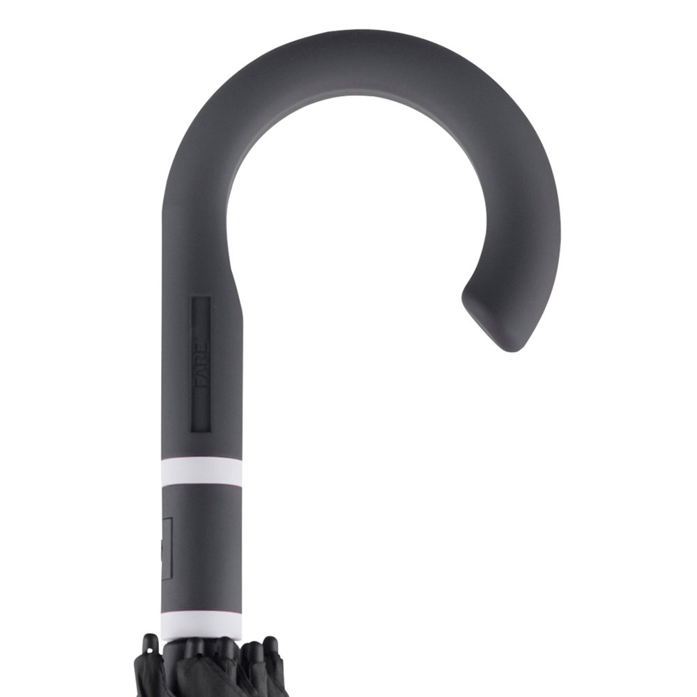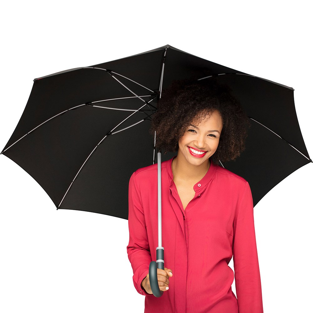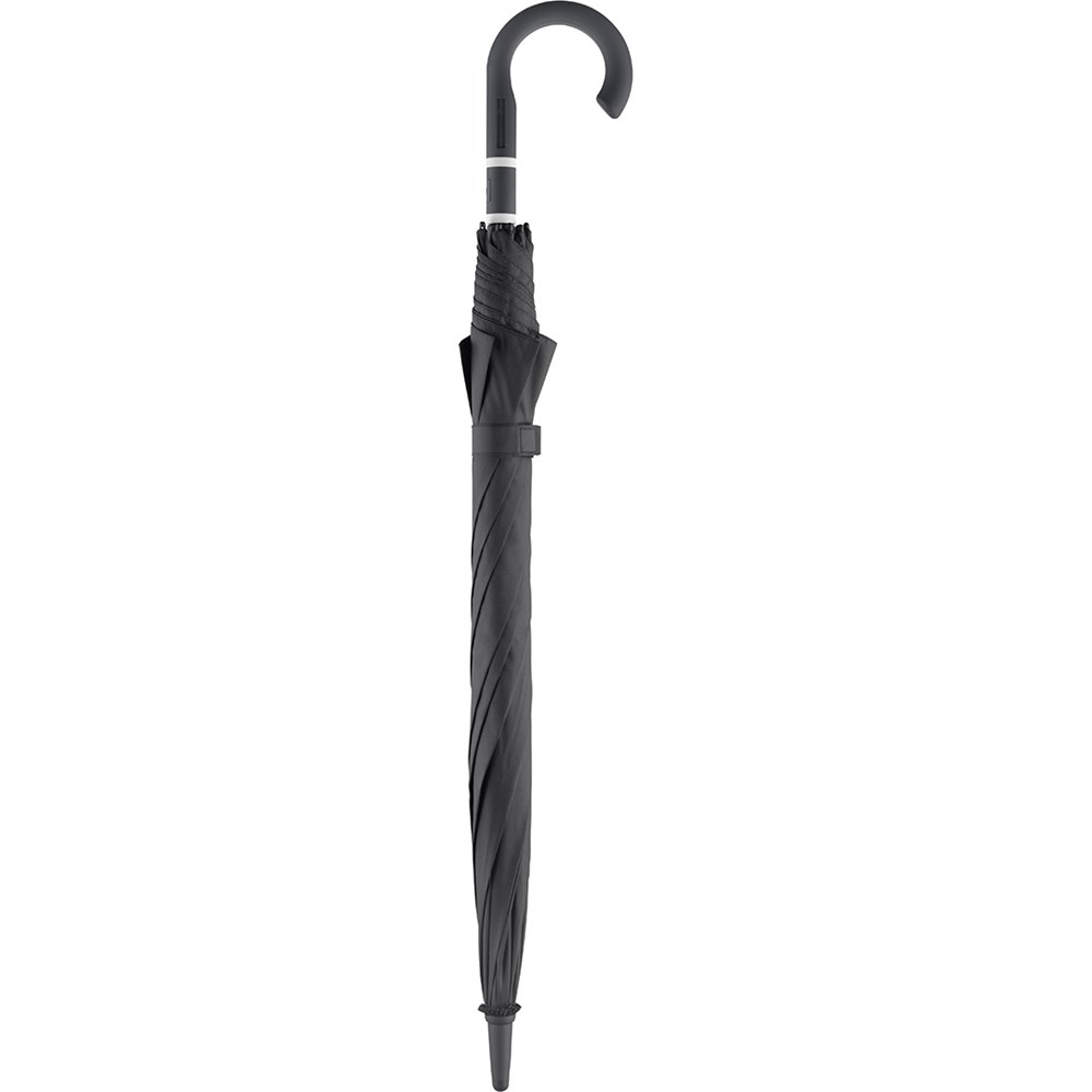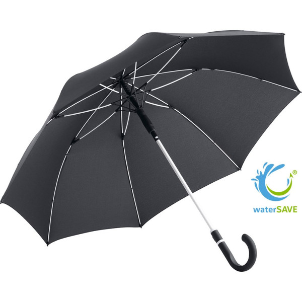 Stylish automatic umbrella in medium size with coloured shaft and coloured ribs Convenient automatic function for quick opening, high-quality Windproof PLUS system for maximum frame flexibility in stormy conditions, flexible fibreglass ribs, stable steel shaft with coloured plastic tube, polyester pongee material made of recycled plastics, eco-friendly thanks to original waterSAVE cover material, with waterSAVE® label on the closing strap, shapely Soft-Feel crook handle with colored handle rings, integrated push-button and promotional labelling option. Also available as mini umbrella (art. 5084, 5484, 5584) and as golf umbrella (art. 2384). Awarded with Promotional Gift Award 2016.