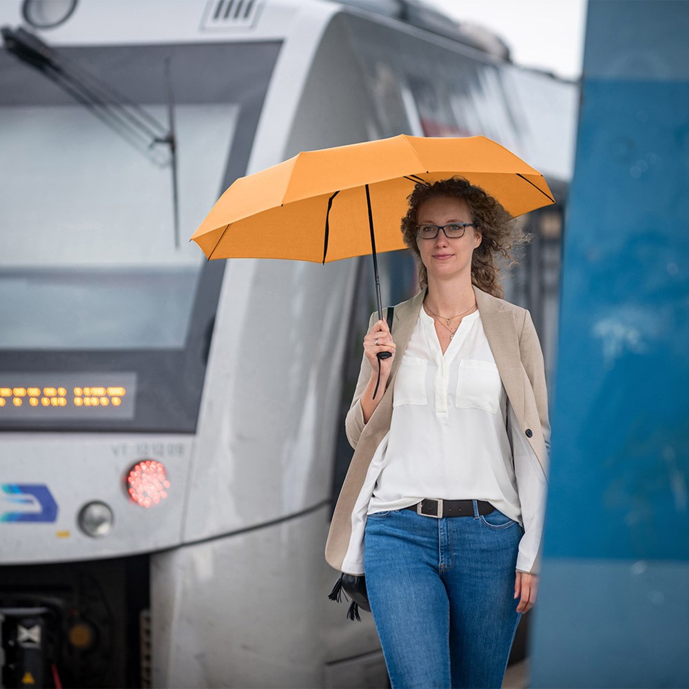 Attractively priced manual opening pocket umbrella Easy to handle thanks to sliding safety runner, Windproof system for higher frame flexibility and stability in windy conditions, Soft-Touch handle with elastic loop and promotional labelling option