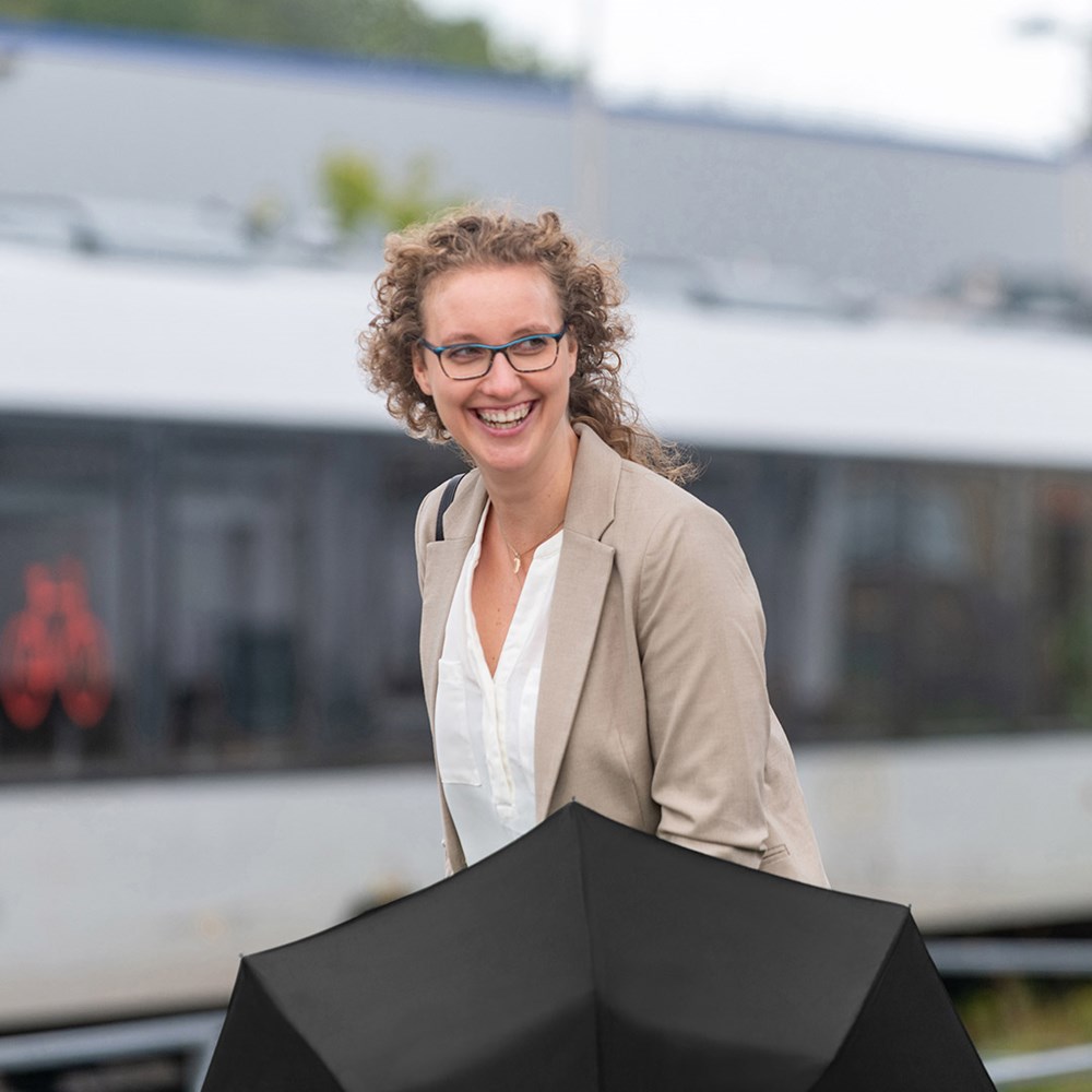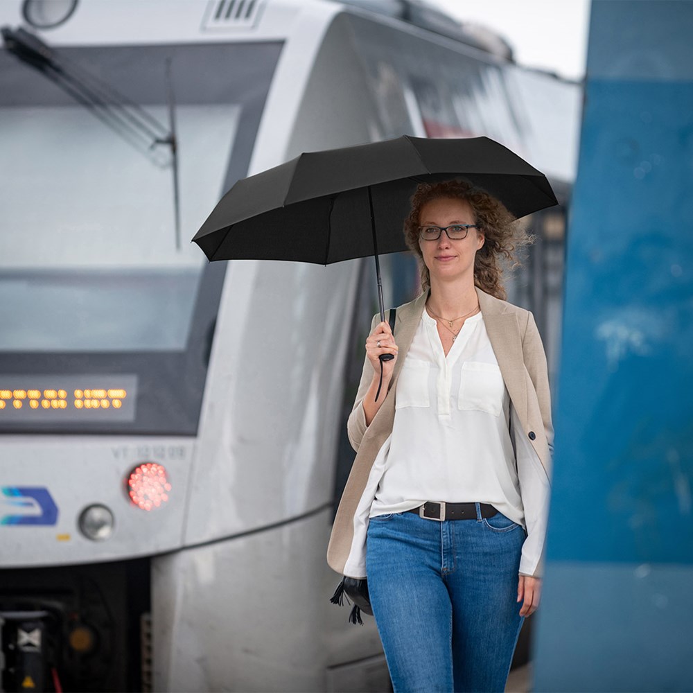 Attractively priced manual opening pocket umbrella Easy to handle thanks to sliding safety runner, Windproof system for higher frame flexibility and stability in windy conditions, Soft-Touch handle with elastic loop and promotional labelling option