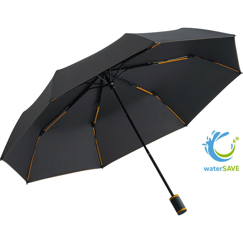 Stylish manual opening pocket umbrella with coloured elements Easy handling due to safety runner, high-quality Windproof PLUS system for maximum frame flexibility in stormy conditions, flexible fibreglass ribs, polyester pongee material made of recycled plastics, eco-friendly thanks to original waterSAVE cover material, with waterSAVE® label on the closing strap, attractive design thanks to coloured ribs, handle rings and seams, Soft-Feel handle with promotional labelling option, sleeve with coloured seam. Also available as mini umbrella (art. 5484, 5584), midsize umbrella (art. 4784) and as golf umbrella (art. 2384).