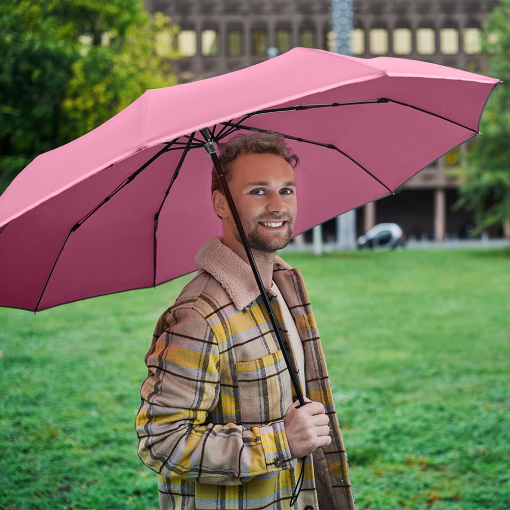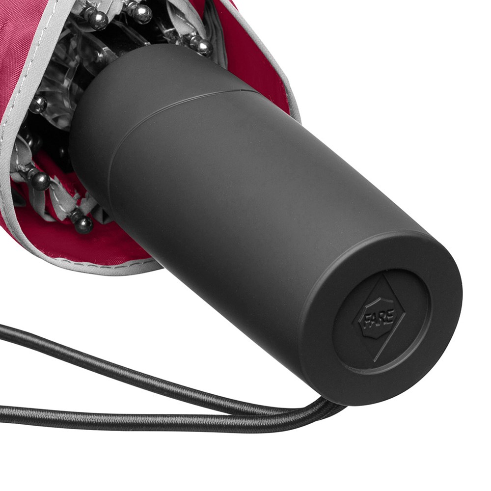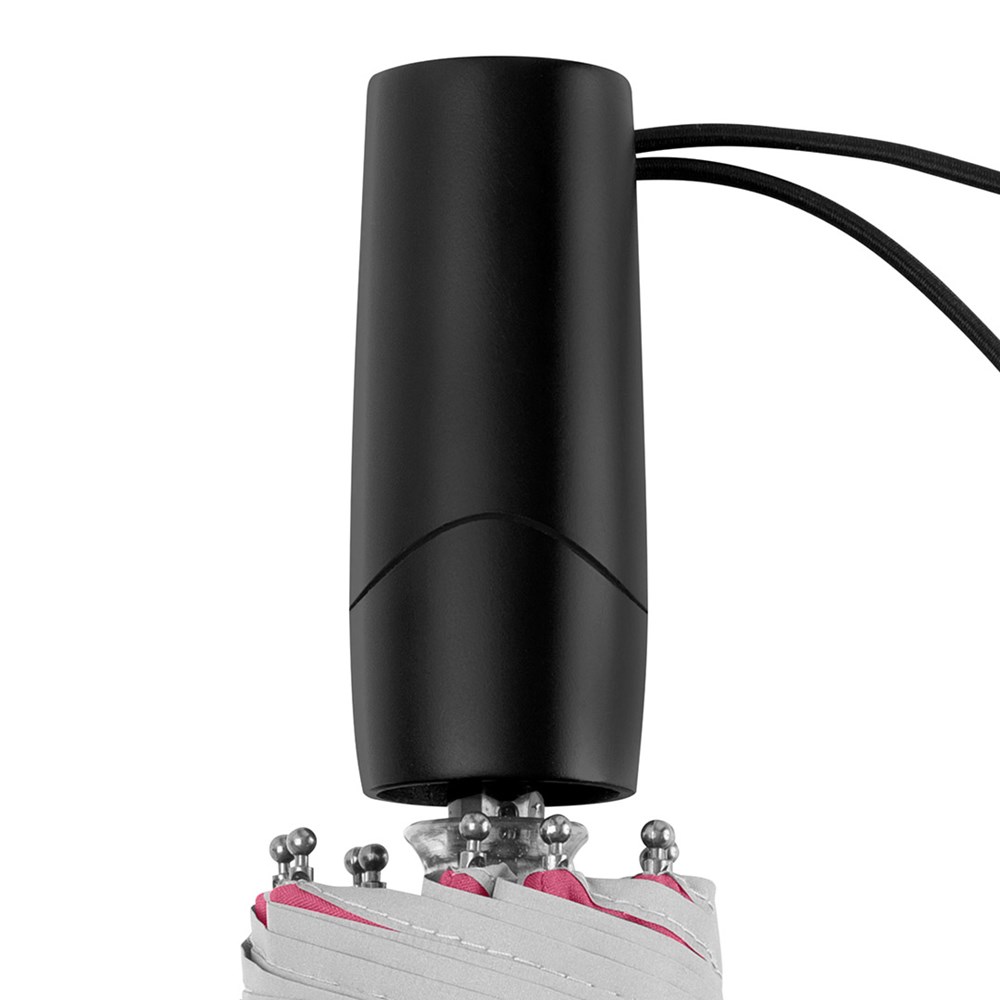 Stylish manual opening pocket umbrella in oversize with fashionable reflective piping Easy to handle thanks to sliding safety runner, high-quality Windproof PLUS system for maximum frame flexibility in stormy conditions, special umbrella shape through 10 panels, cover with trendy reflective piping in silver, comfortable Soft-Feel handle with elastic loop and promotional labelling option, generous diameter, sleeve with trendy reflective piping.