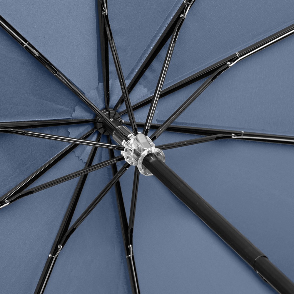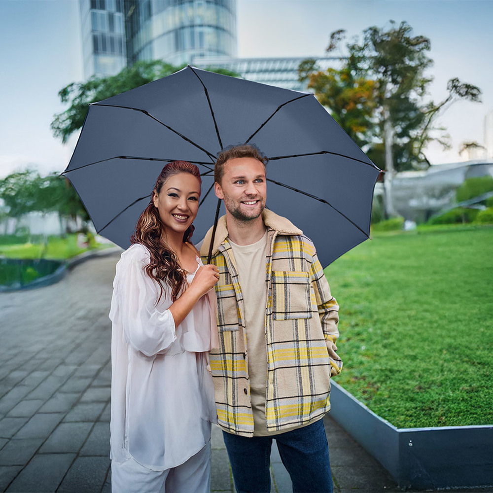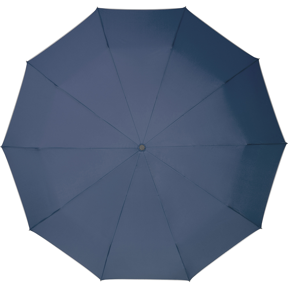 Stylish manual opening pocket umbrella in oversize with fashionable reflective piping Easy to handle thanks to sliding safety runner, high-quality Windproof PLUS system for maximum frame flexibility in stormy conditions, special umbrella shape through 10 panels, cover with trendy reflective piping in silver, comfortable Soft-Feel handle with elastic loop and promotional labelling option, generous diameter, sleeve with trendy reflective piping.