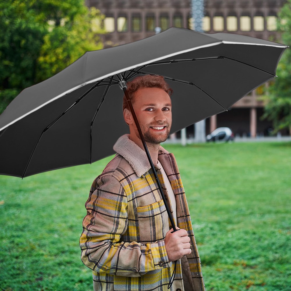 Stylish manual opening pocket umbrella in oversize with fashionable reflective piping Easy to handle thanks to sliding safety runner, high-quality Windproof PLUS system for maximum frame flexibility in stormy conditions, special umbrella shape through 10 panels, cover with trendy reflective piping in silver, comfortable Soft-Feel handle with elastic loop and promotional labelling option, generous diameter, sleeve with trendy reflective piping.